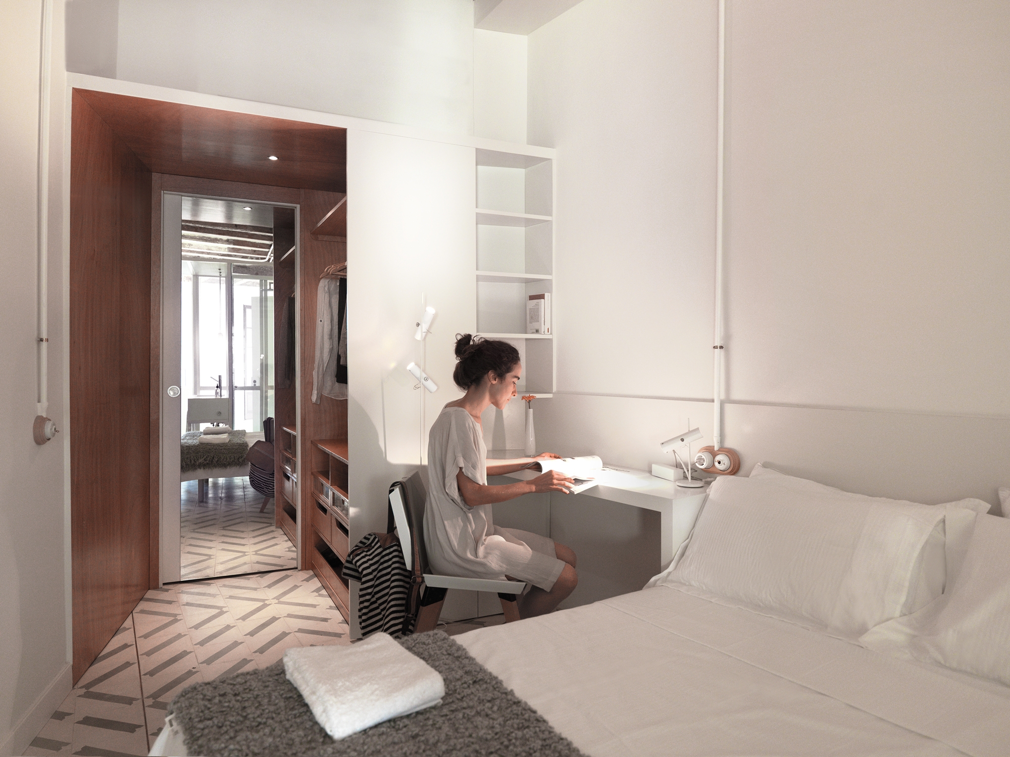 El método seguido para confrontar la nueva organización del espacio es el uso de un eje longitudinal, desde el que los distintos objetos como, la cocina en isla, la cama y el módulo de baño se descuelgan, liberando a las paredes de ellos y dirigiendo el proyecto hacia una experiencia organizativa más conceptual y contemporánea. La privacidad de aborda desde un segundo eje, el transversal. Este delimita el espacio común del privado, y se define mediante lo que los arquitectos denominan ¨Caja de luz¨.