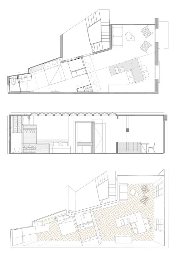 El “Lightslice” es un estrecho y triangular apartamento localizado en el histórico Ensanche de Barcelona. Los arquitectos destriparon el oscuro organigrama previo del apartamento y lo rescataron de su más profunda decadencia, transformándolo en un lujoso y luminoso espacio completamente nuevo. Para sacar el máximo partido de los 46 m² y de la luz disponible, Cometa Architects, eliminaron toda la compartimentación para crear un espacio completamente abierto donde fluyera la luz natural. Se retiraron todos los pavimentos superpuestos a lo largo del tiempo y se restauraron las antiguas vigas de madera carcomidas.