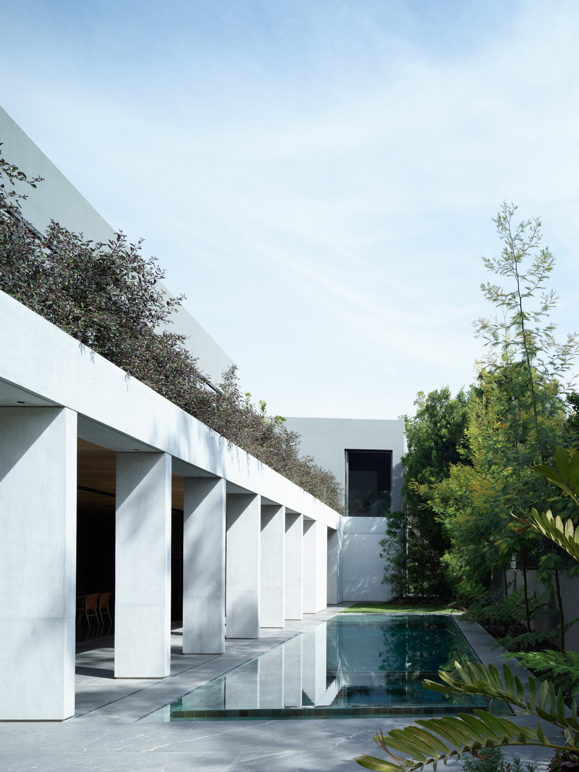 The project begins with this social heart as described earlier. It is a very functional house, somewhat rationalist too (it can be seen in the language of the house and its structure and modular rhythm) being a very simple house to understand. Basically, we decided to group the spaces that needed more privacy, bedrooms, bathrooms, studies, etc. In a certain orderly way that embraced the main void, which is the social area, generating a very interesting route accompanied by natural lighting and ventilation in the form of patios and reflecting pools, for example.