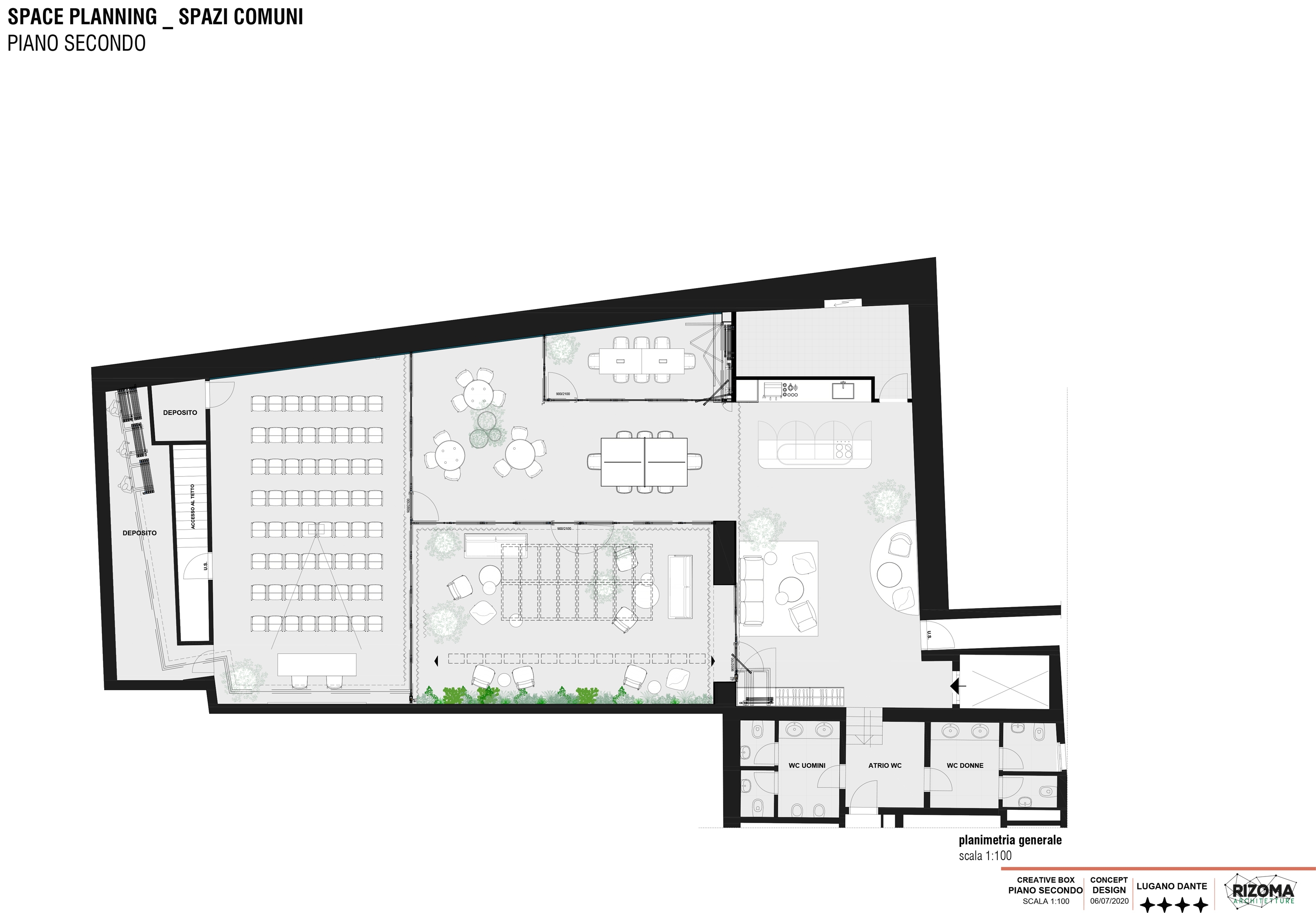 The space on the second floor, now dedicated to conferences and events, is redesigned as the Creative Box of the hotel, a place for work, even temporary, equipped with a winter garden around which spaces for business meetings or conference activities are developed, as well as more informal spaces where you can have fun playing table tennis.