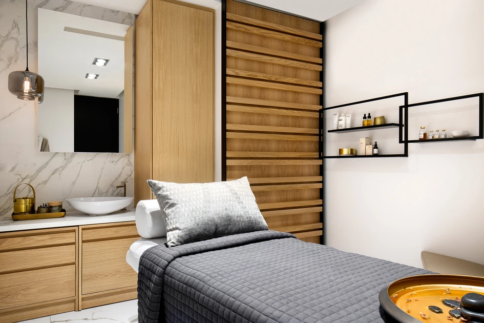 A focal water feature facilitates the seamless transition from the vibrancy of the hair salon and nail bar to the serenity of the treatment rooms. Each treatment room has an on-suite private cabin, including bathroom and steam shower.