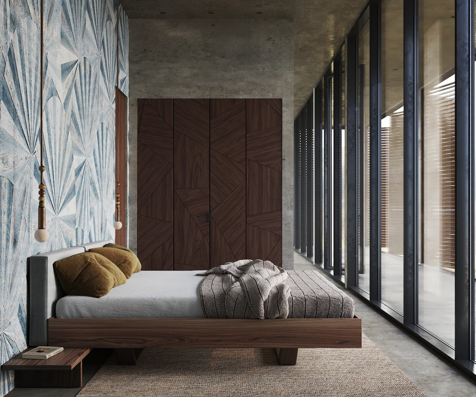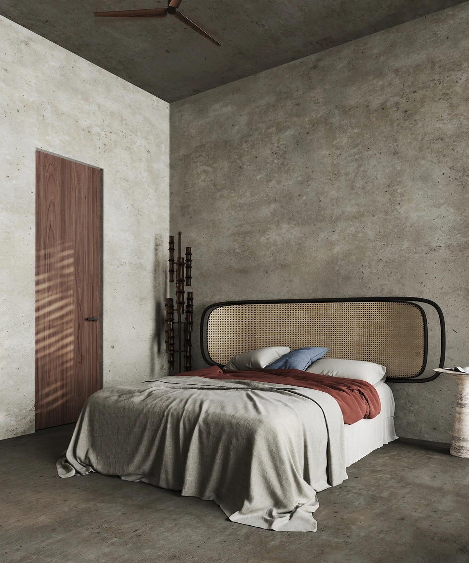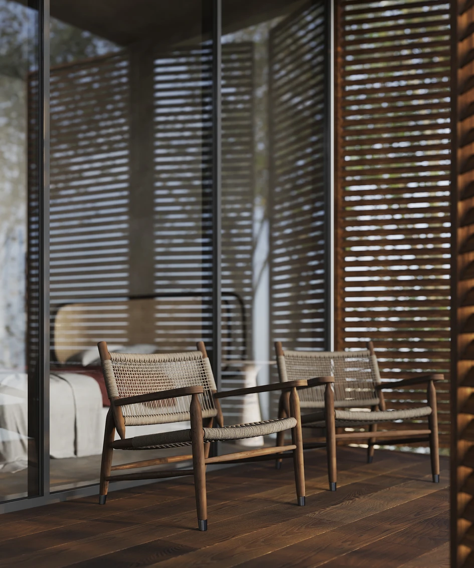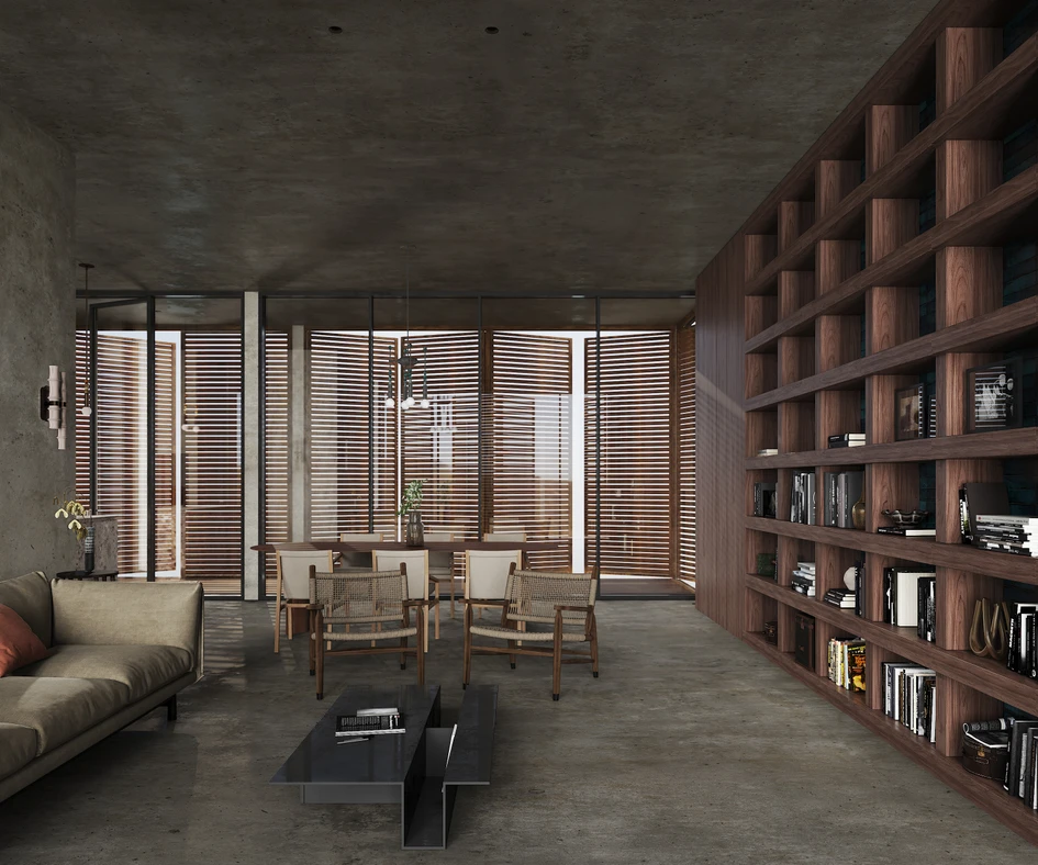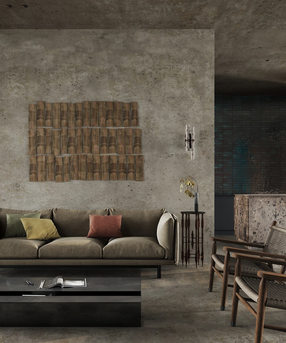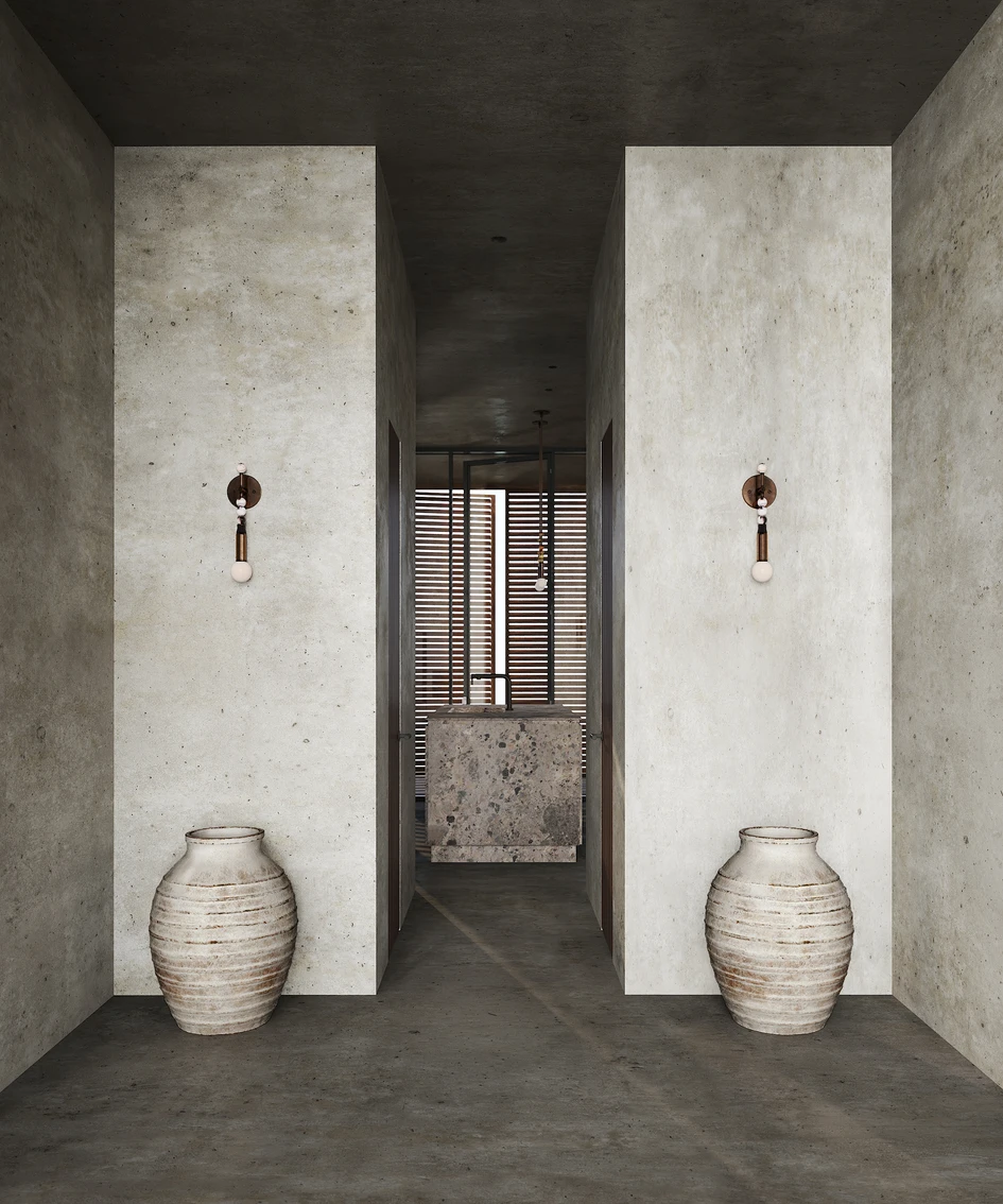 Their challenge was twofold: the house had to blend in with the surrounding landscape and be on equal footing with the unique architecture of the area. Backed by a palette of natural materials and earthy colors, interior design "plays with the concepts of authenticity, comfort, simplicity, origins and aims to create a parallel between the interior and the exterior beauty of the landscape, the undisputed soul of the place.“ Materiality, texture, color are the key points in the design of PUNTOFILIPINO. Raw earth-toned concrete and Marazzi terracotta ceramic on the walls perfectly complement the exposed wooden Venetian blinds around the periphery of the entire home.