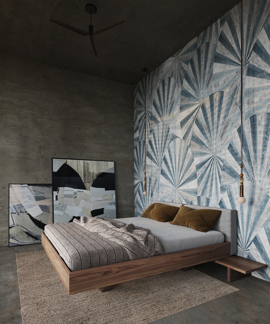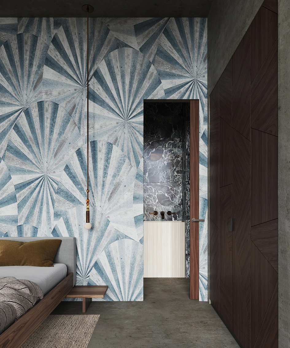Wood and natural stone surfaces further enrich the canvas of natural materials, with blue tiles and Apparatus brass, leather and jasper pendant lamps adding to the texture palette. A series of floor-toceiling deep blue accents add pops of color, while the use of hickory wood on the freestanding shelving adds to the sense of refinement and craftsmanship.