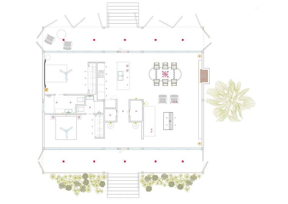 Perched on the side of a hill, the house enjoys panoramic ocean views that give guests the opportunity to observe the choreography of the ferries and cruise ships sailing between the islands.