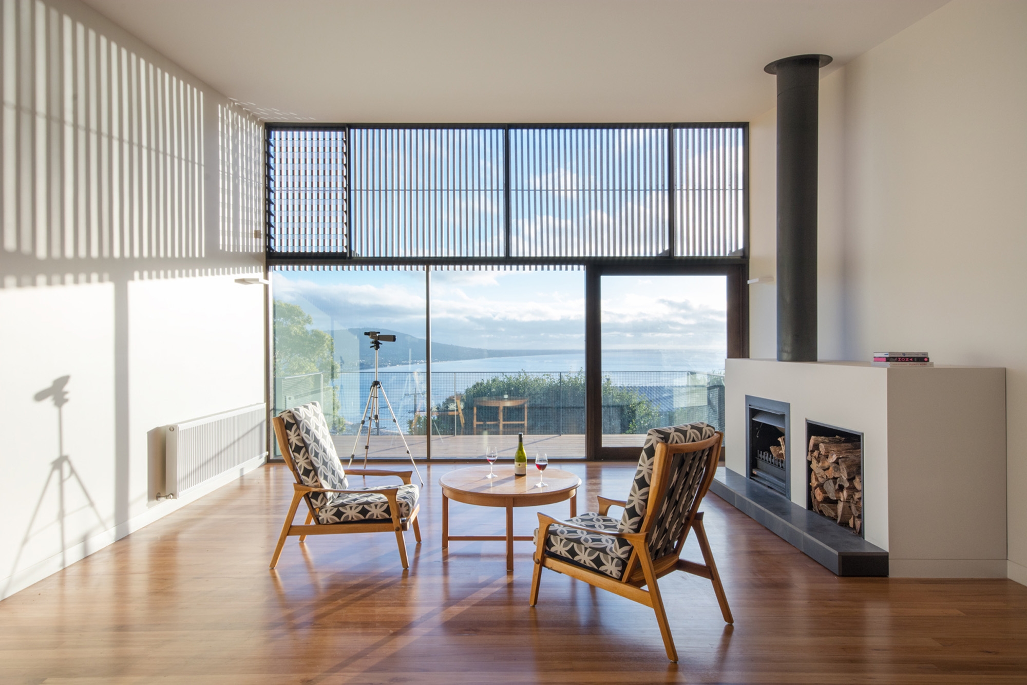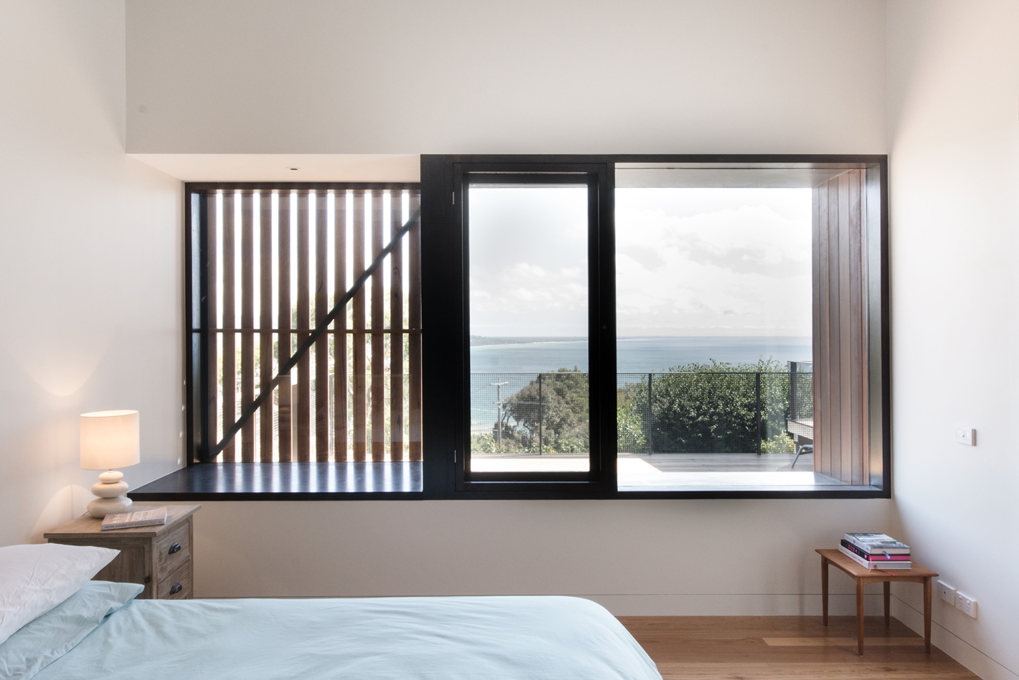 Providing protection from the extreme weather conditions of its seaside location, windows are concealed behind operable timber shutters and screens to ensure the spaces are usable year-round. When open, the shutters may also be manipulated to create framed views, intimate outlooks, and playful splays of internal sunlight.