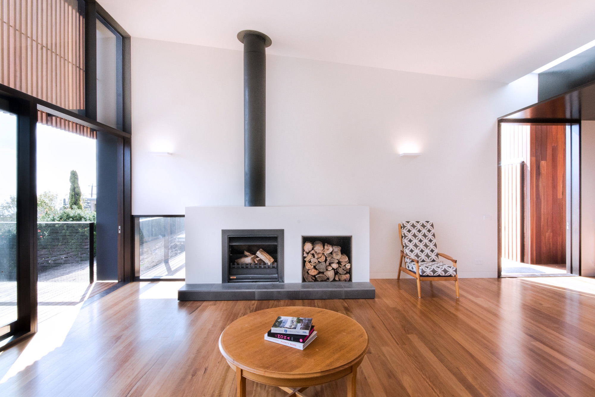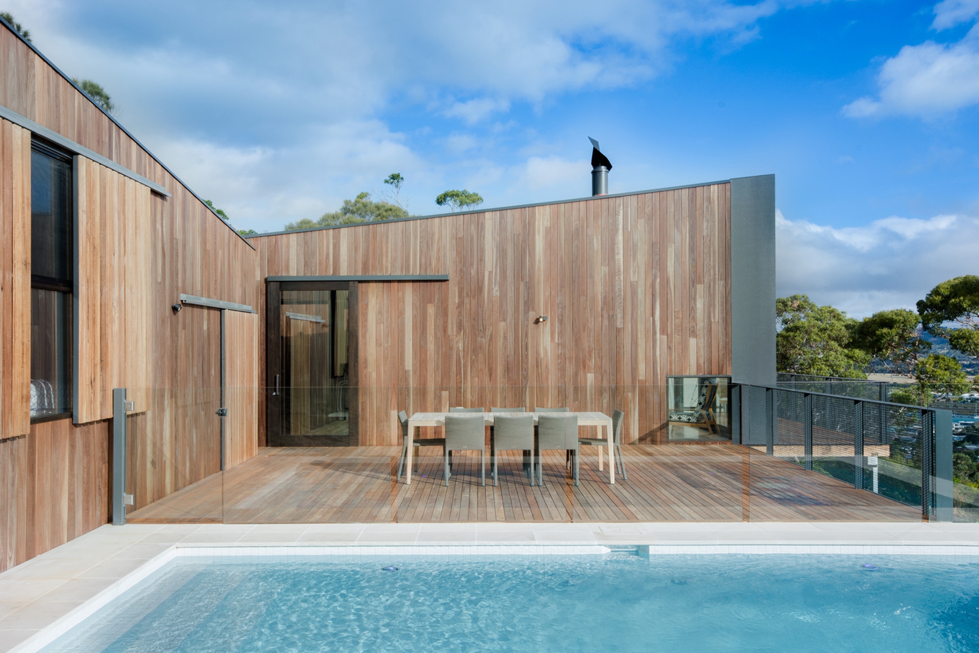 The single storey dwelling extends south west towards the bay to take advantage of expansive unobstructed views across the Peninsula. By appropriating the sloped site as such, the building emerges from the landscape to give the appearance it is effortlessly floating above the ground, allowing the house to engage with the site in both form and materiality. The application of natural Australian timber hardwoods for the external cladding reference the colours of the surrounding landscape and help the building to immerse itself as an integral extension of the site.