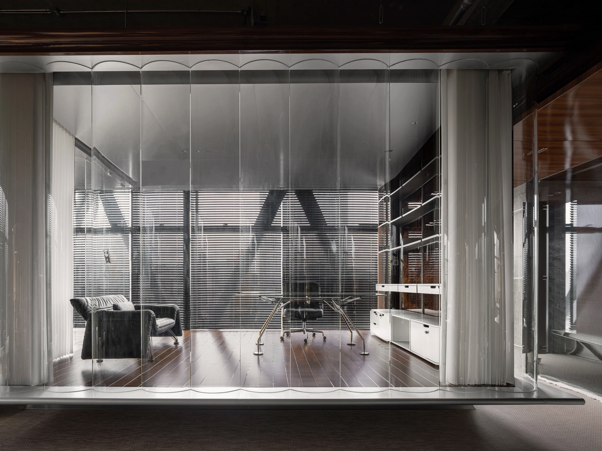 The office of the Principal Designer extends the classic architectural elements. The suspended block is supported by a large metal framework, while the curved glass adds a touch of lightness and shapes the texture of the open area, further enhancing the metal texture of the refined retro furniture in the office. The space features a unique combination of artistic wood grain material, lines, and particles, resulting in a harmonious blend of classic and innovative elements in a truly avant-garde fashion.The three steps in the staircase have anti-slip icons on them which represent the three brothers who own the brand. Each icon depicts the given name of a respective brother. This design not only adds a symbolic touch to the space but also subtly reflects the owners' spiritual beliefs through the design details.