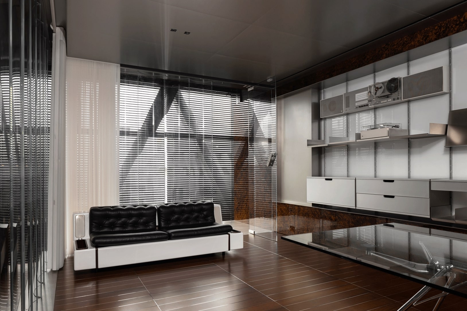 The warm-colored fur carpet adds a cozy touch to the conversation area, where sofas of various leathers and colors are combined with high and low lamps to create a sense of depth in the room.