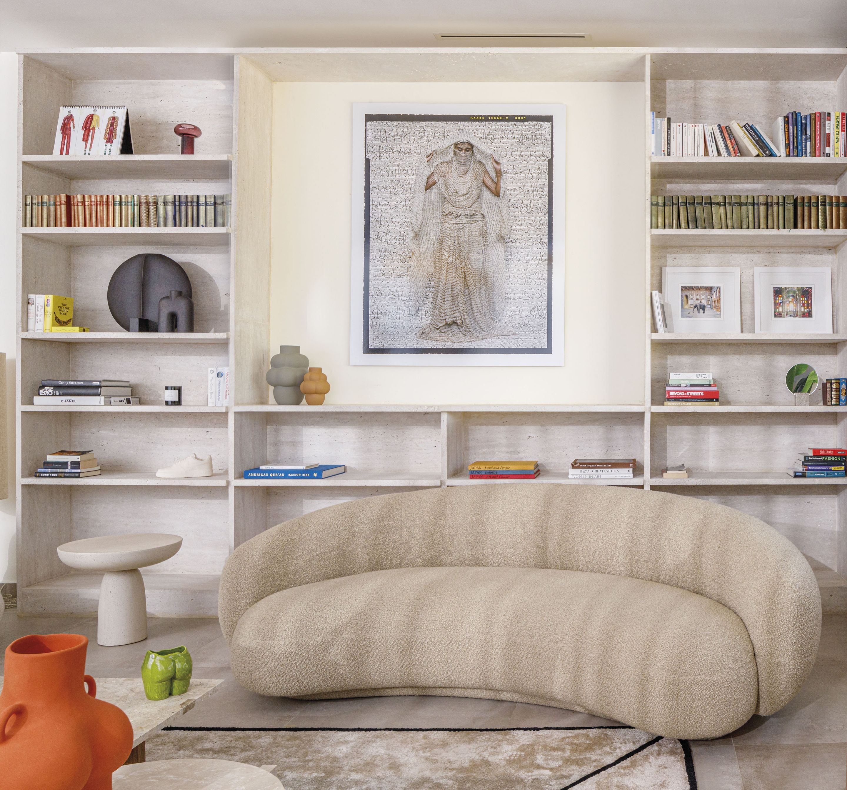 Facing the bookshelf, the owners’ personal books and trinkets narrate their lives, while the bean-shaped sofa, placed in the corner, preserves the view. Nothing synthetic is used here, from the leather pendant lights, plaster half-pots mounted on the walls to hold the light fixtures like flowers, to the scattered coffee tables in the living room and reading nook, near the chaise longue facing the pool. In this harmony of soft tones, enhanced by textured rugs, white-on-white, the space invites you to lose track of time, peacefully immersed in reading.