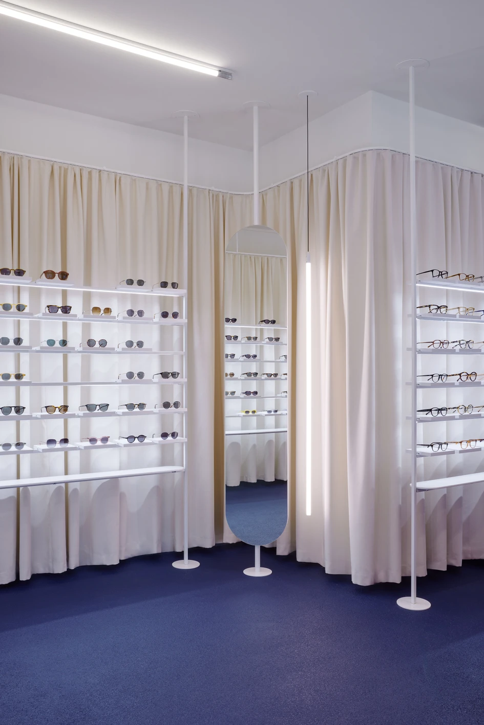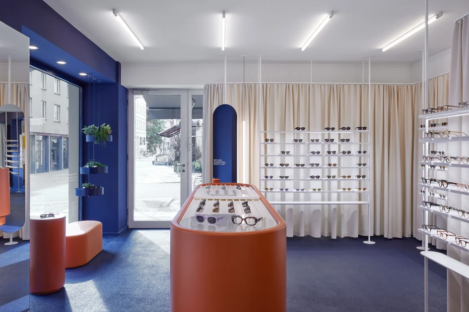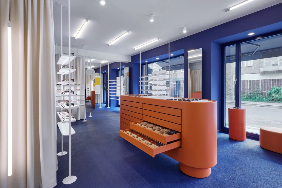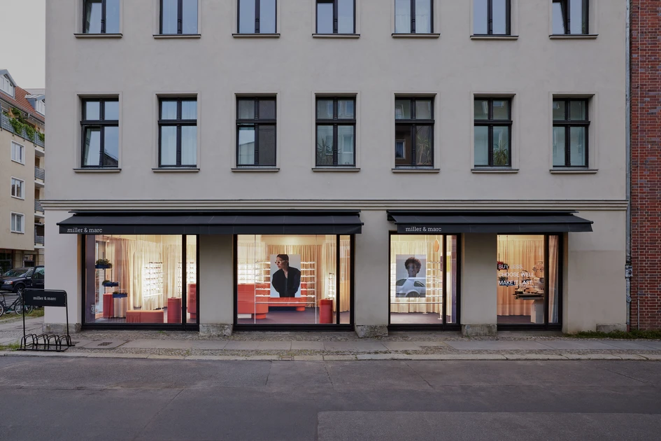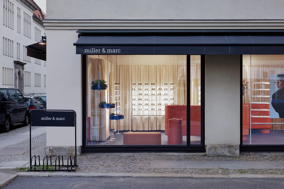 Reflecting the brand identity - Founded in Madrid in 2016, the Spanish eyewear brand MILLER & MARC designs contemporary and high-quality handcrafted eyewear. The brand‘s first flagship store in Germany covers 88m2 and is located on Auguststraße, in close vicinity to many art galleries, shops and restaurants. The large window fronts provide a first glimpse of the unique interior of the boutique from the outside: A vibrant colour range that sets warm terracotta shades against a deep cobalt blue attracts visitors to the open-plan retail space, creating an elegantly Mediterranean feel with a neo-brutalistic twist. The retail design thus refers to the Spanish brand‘s origins and illustrates COORDINATION‘s core competence — reflecting brand identity with creative sensitivity and expressive spatial concepts. The centrepiece of the interior design is the custom designed terracotta-coloured retail furniture, which has an almost sculptural appearance due to its oval shape. It serves to display the current MILLER & MARC collections and is centrally located in the open salesroom. Delicate, white shelves are set against a sand-coloured curtain band that wraps itself around the space, with carefully placed lighting elements. The clever zoning with free-standing furniture creates open lines of sight for visitors, who can be inspired by the brand‘s large variety of glasses and receive comprehensive consultation from the responsible optician on site — from eye tests to frame selection and lens cutting. A controlled mix of tactile and textile surfaces and the rich colour palette create a reduced and elegant spatial impression that centres its attention on both the products and the visitors. „The aim of our design was to create an atmospheric space that allows the Spanish origin of the MILLER & MARC brand to enter into an exciting dialogue with Berlin while using as few means and interventions as possible“, explains Flip Sellin, project manager and creative director of COORDINATION.