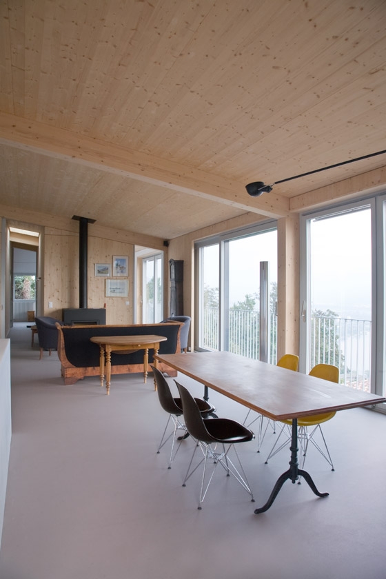 Im Innern lebt man im Rhythmus der Primärstruktur den Übergang vom Wohnteil zu den privaten Zimmern entlang dem Gebäude. Auf der Südseite wird offen gewohnt und gegessen. Die beeindruckende Aussicht wird mit grossen Fenstern gerahmt und der Aussenraum mit einer Terrasse zum Garten erschlossen. Die beiden Schlafräume und das Hauptbad richten sich zum See und zeichnen die Struktur des Gebäudes ebenfalls nach. Zudem sind sie untereinander, als auch zum Hauptwohnbereich mit verbindenden Türen entlang der Fassade öffenbar. So ensteht eine flexible Wohnform, die es immer ermöglicht ein Zimmer privat zu bewohnen oder das Gebäude in seiner ganzen Ausdehnung wahrzunehmen.