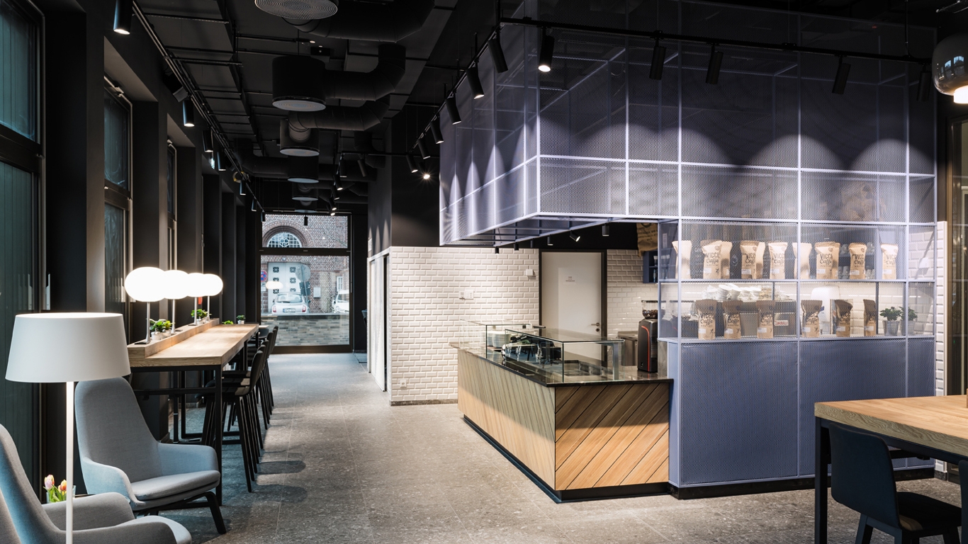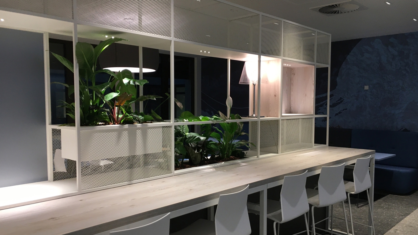 A customised special solution was required for the Euler Hermes (Allianz Trade) office building in Hamburg, which was custom-made from high-quality and durable metal. In addition to an extravagant wall panel in the entrance area, which was planted with moss as a visual highlight, semi-transparent room dividers with mesh inserts made of expanded metal were produced for the canteen and staff areas. Some of these were fitted with planters to create a calming and natural room atmosphere.