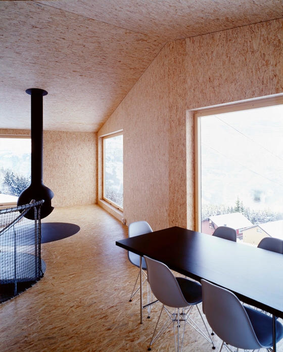 Im Wohngeschoss kehrt die vertraute Form des Chalets wieder. Die Proportionen des Raums stehen jedoch im Spannungsverhältnis mit der Dimension der riesigen Panoramafenster.