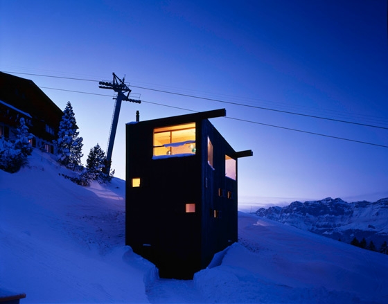 Durch seinen Knick passt sich der Baukörper der Kurve des Hangverlaufs an. Äusserlich variiert das Haus das omnipräsente Thema des Chalets mit seiner dunklen Holzschalung und kleinen Fensteröffnungen zum Bild eines Chaletturms mit riesigen Panoramafenstern.