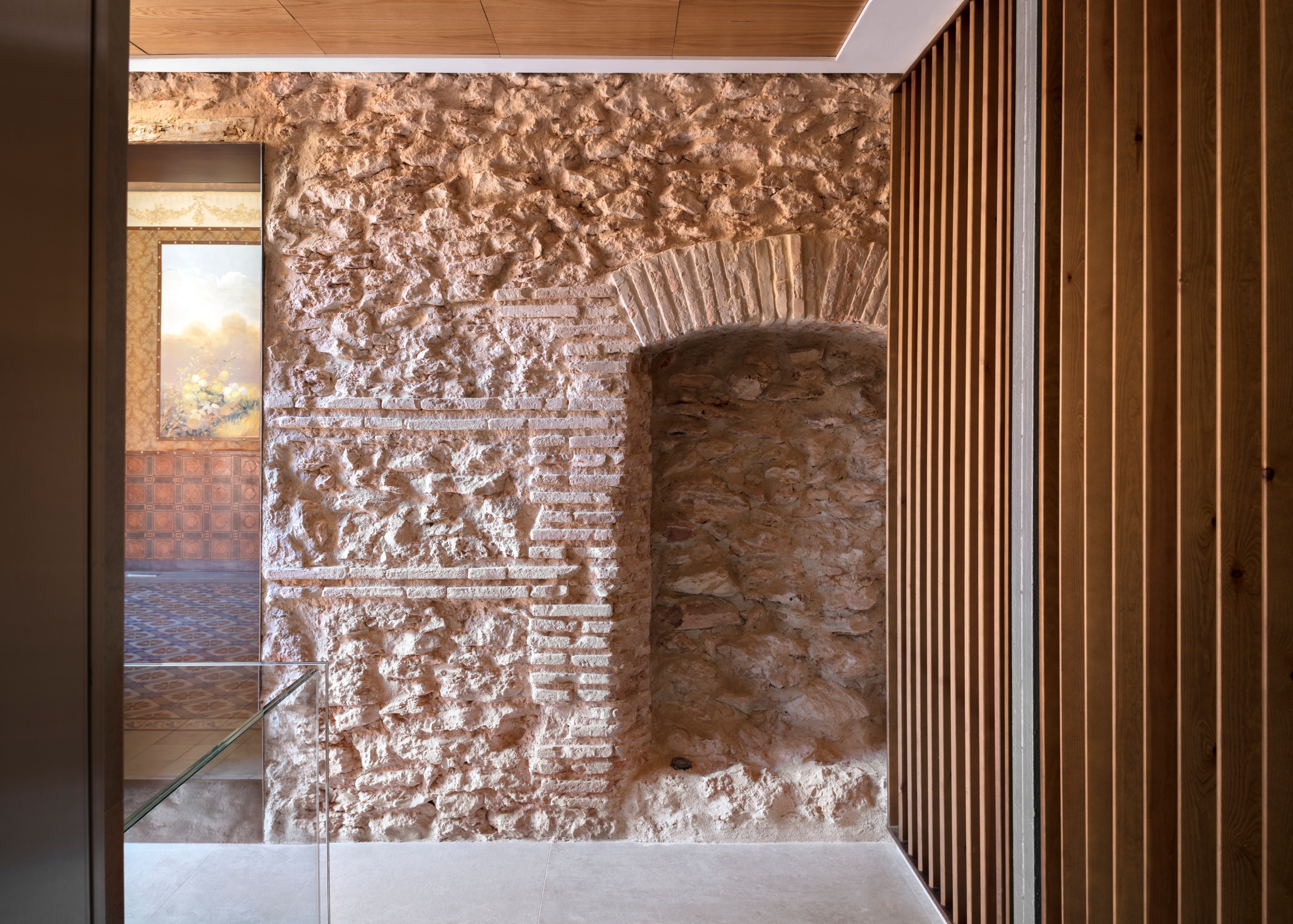 Tras la necesaria rehabilitación estructural, el equipo de arquitectos, arqueólogos y restauradores, trabajan en el edificio de manera que cada uno de los paramentos que lo conforman (suelos, techos y muros) se estudia y proyecta como si de un plano independiente se tratara.