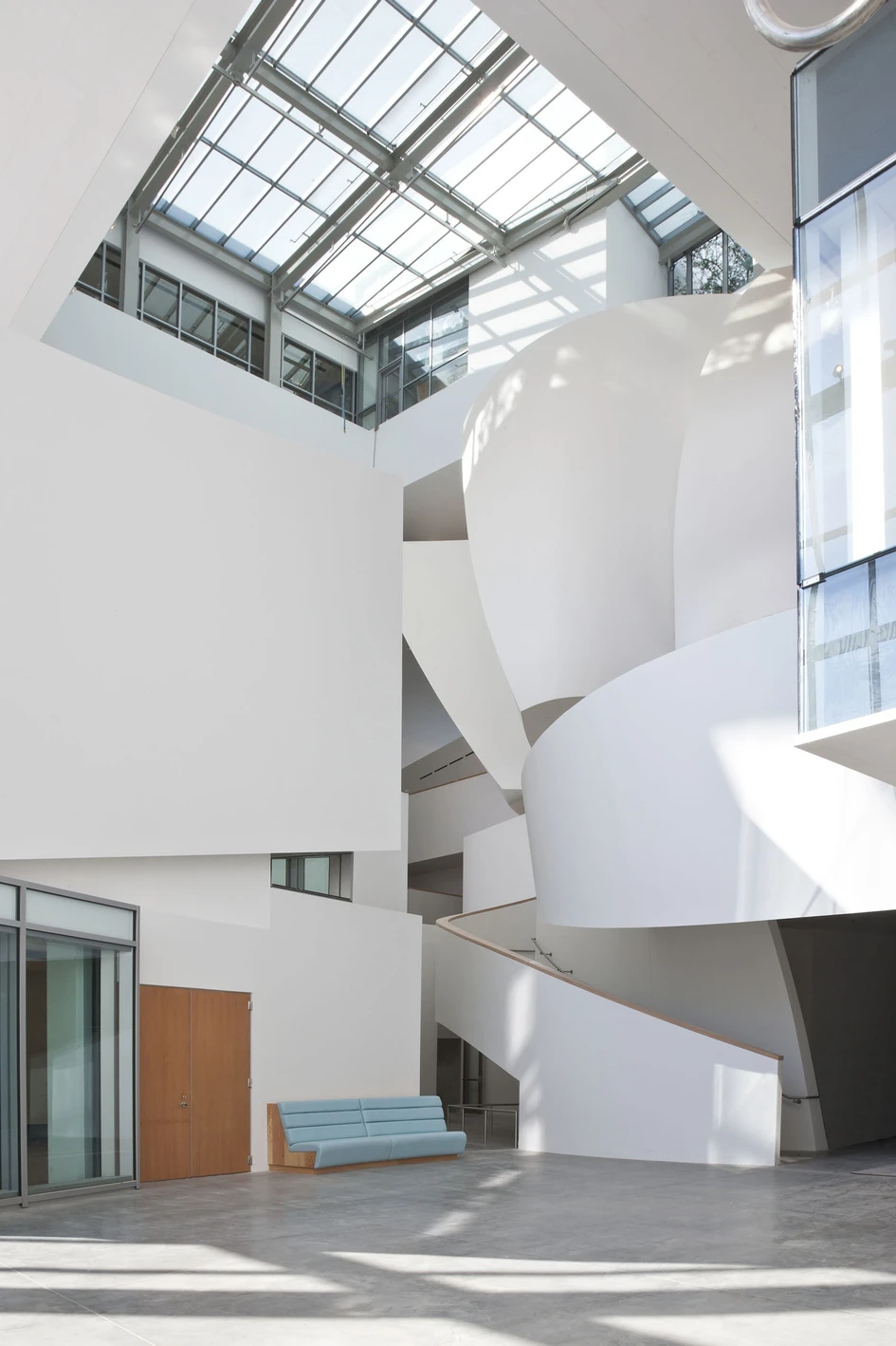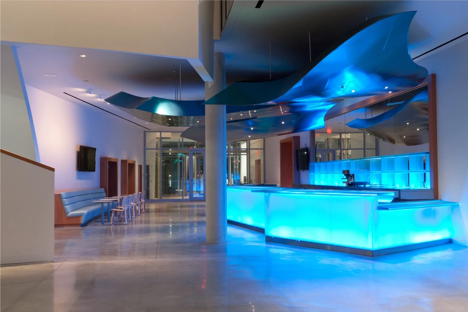 The six-story high, glass-fronted atrium provides a spectacular and dynamic entry-point to the building, with its playful, tumbling geometric forms delineating the structure of the internal spaces. When viewed from outside the building at night, these large, dramatically-lit, irregular forms take on the character of performers on a proscenium stage, turning the building itself into a performance. The skylit atrium incorporates the campus’ box office, a large, illuminated glass bar with an undulating, blue-tinted titanium canopy, and baby-blue banquettes with plywood backing. The space features polished concrete floors and painted walls.