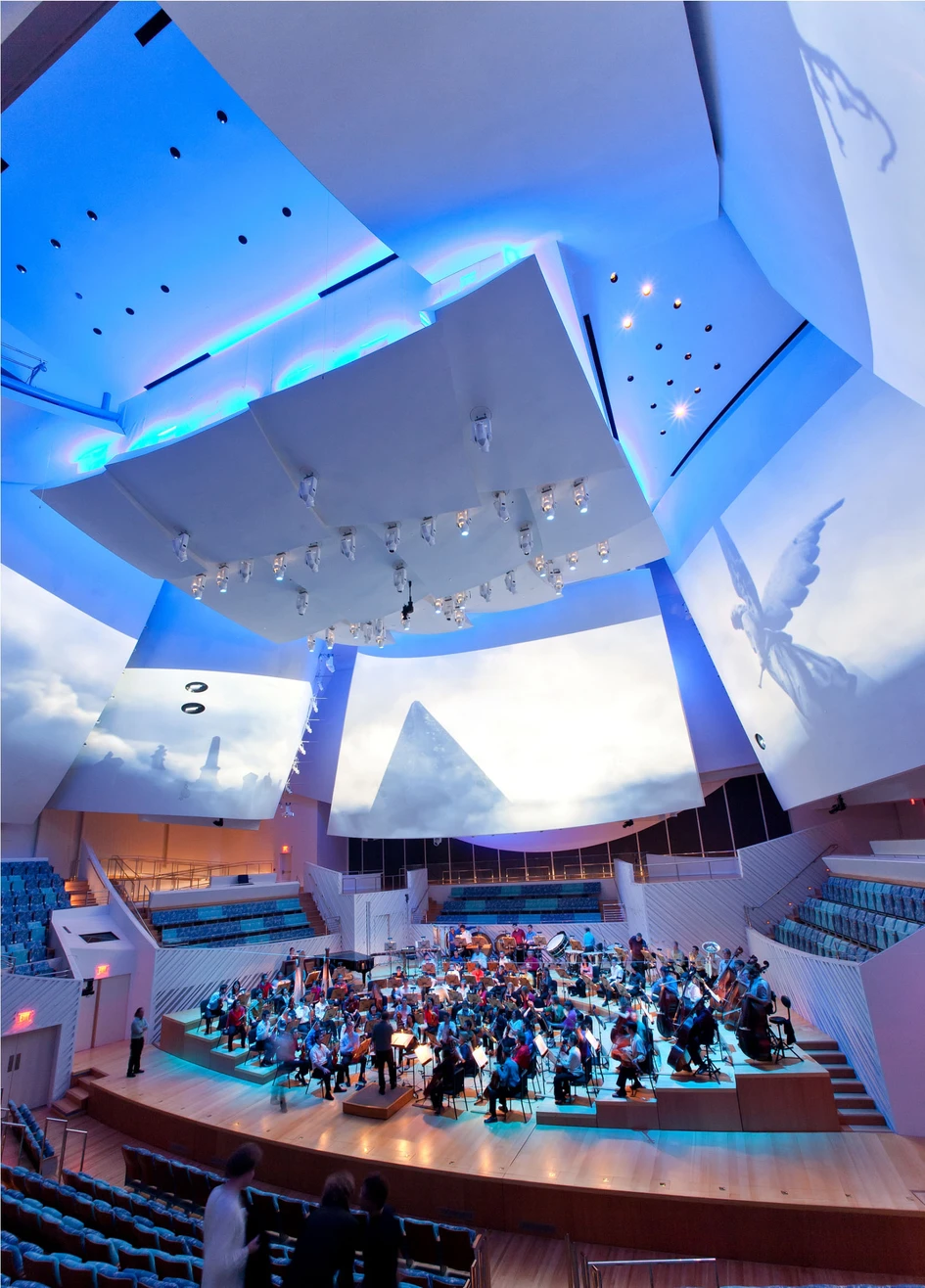 The hall’s seats are upholstered in mottled patterns of blues and white – specially designed by Frank Gehry – which are inspired by the building’s tropical location and intended to bring imagery of the water and sky of Miami Beach into the performance hall.