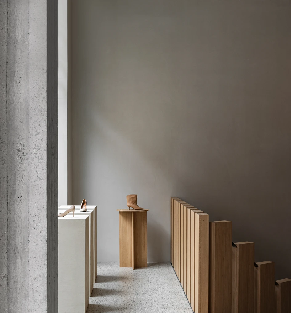 “The intention to form a retail space resembling that of an artist’s atelier, combined with a simplified and stylized warehouse feeling is enhanced by the many freestanding plinths, displaying shoes as artwork in a versatile, yet harmonized, material palette.” – Jonas Bjerre-Poulsen, Norm Architects