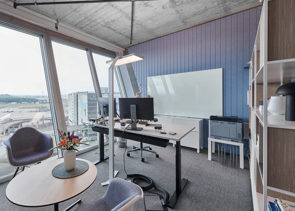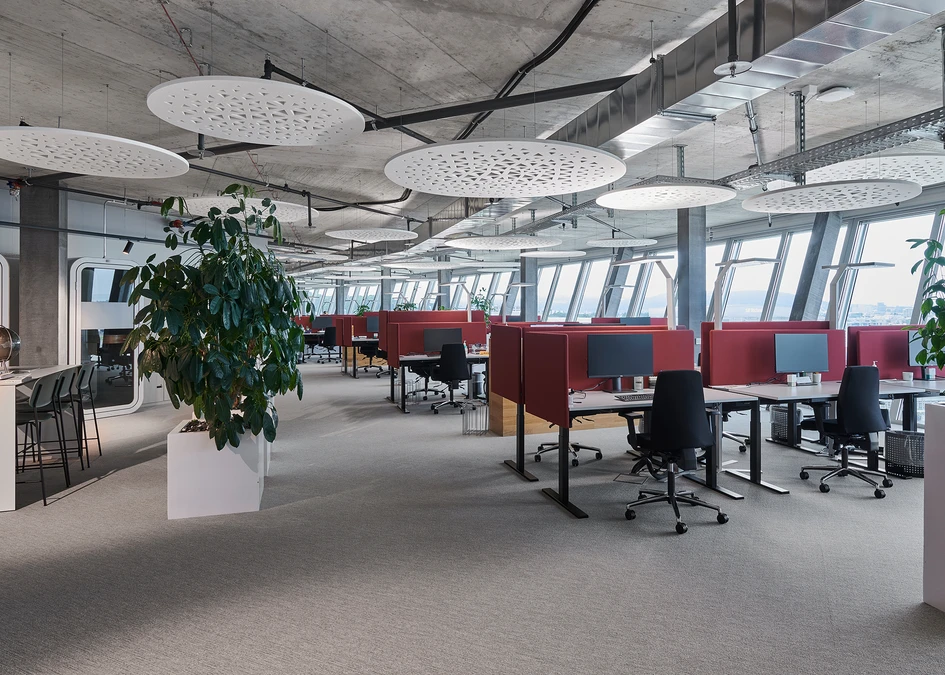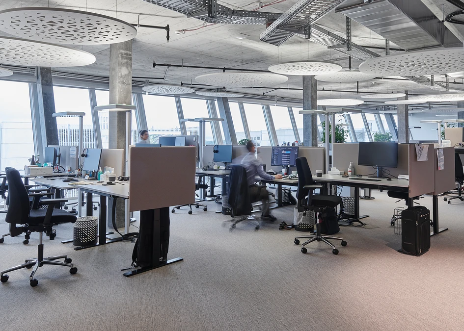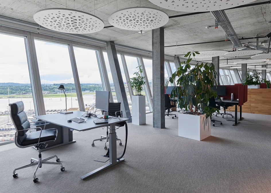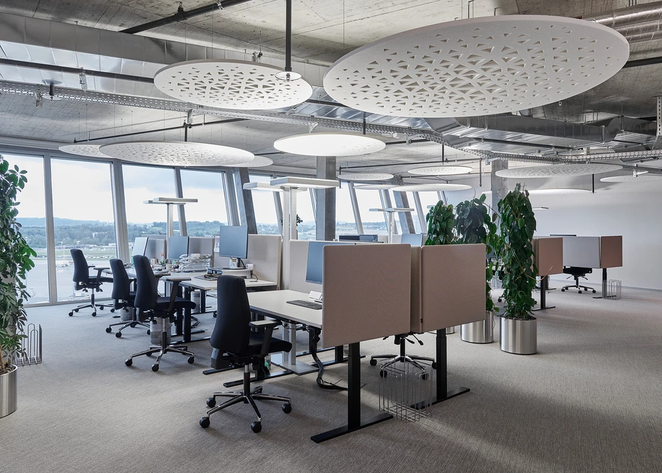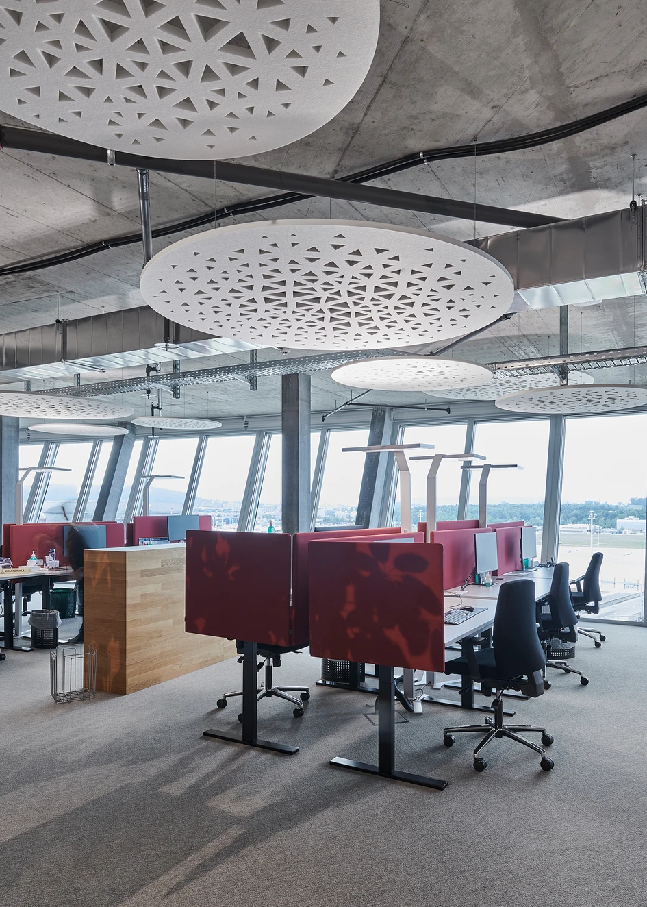 With a magnificent view of the airfield at Zurich Airport, Novo Nordisk teams can enjoy a front-row seat to the air traffic during work. In addition to satisfying the eyes, the new office buildings at The Circle also provide employees with acoustically well-balanced spaces to please the ears and mind.Throughout the space, from recreation rooms to cafeterias and individual workstations, a mix of graphically cut square and round acoustic panels suspend from the ceiling to reduce excess noise in the open-plan office.