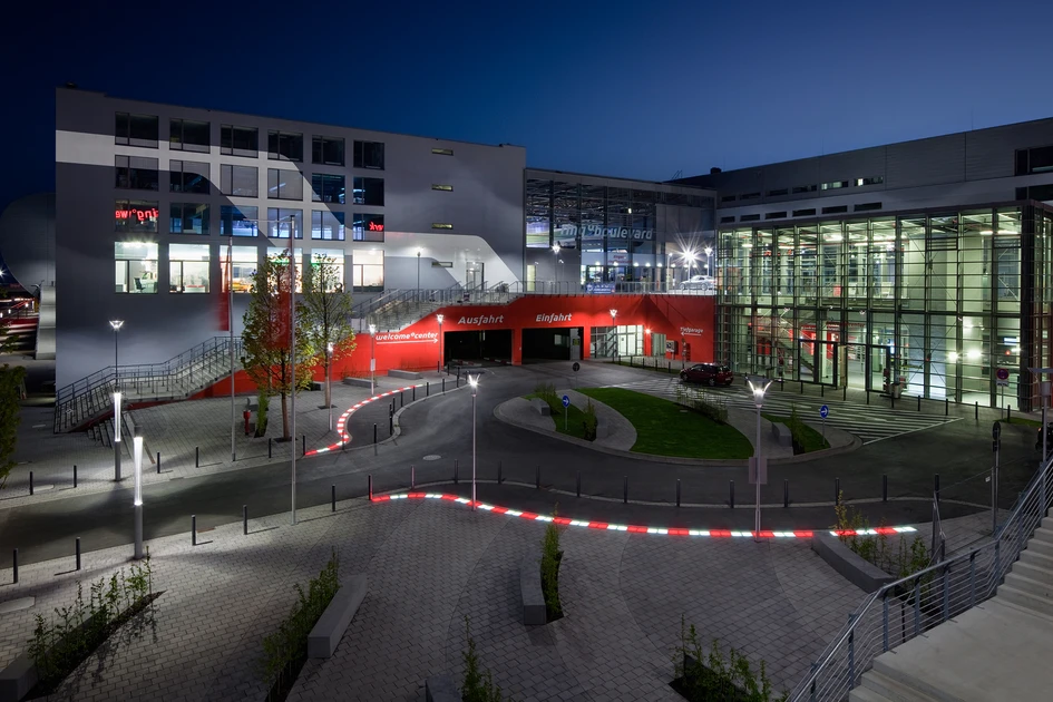 El concepto de luz de TRILUX, que abarca tanto las zonas exteriores como interiores, intenta hacer experimentable para los visitantes el motorismo y su ambiente también fuera del circuito de carreras. Unas estelas de luz delgadas guían a los visitantes que llegan a lo largo de la carretera nacional hacia el centro de bienvenida. Aquí destacan directamente los suelos de luz LED de color blanco y rojo: las luminarias empotrables para suelos recuerdan a las "curbs" del circuito de carreras, marcan la zona de entrada y transmiten ya al entrar en el Nürburgring un sentimiento de dinámica y velocidad.