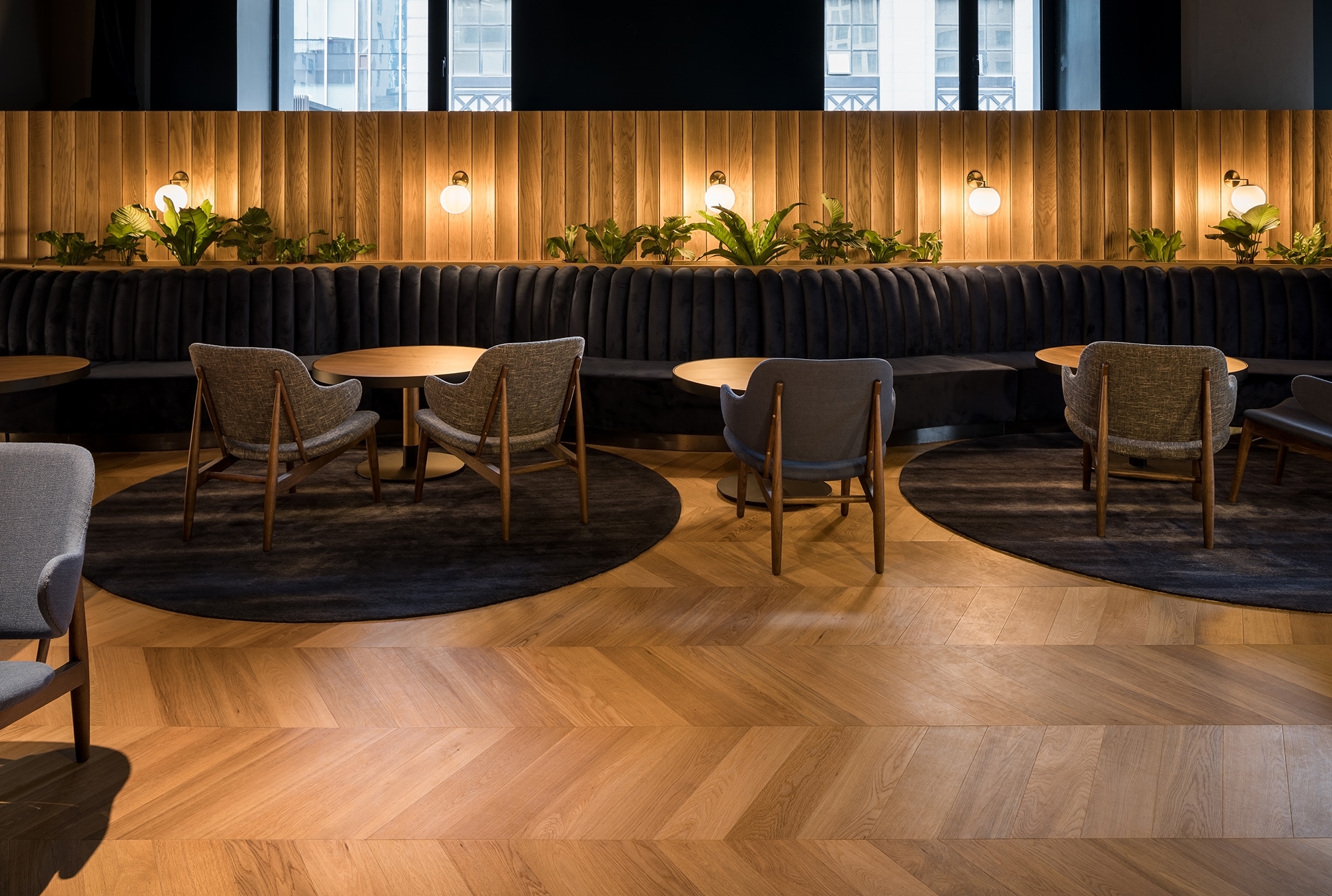For the second level mezzanine lounge the designers wanted to create a more intimate space that overlooks the beer hall and forms a separate VIP area. To distinguish from the more traditional tiles in the rest of the space, the designers chose to use a mix of Oak and Walnut in chevron for the floor. A more refined touch is introduced into the space using a curved dark blue and deep red velvet bench seating. The custom-printed silk wallpaper and wall-mounted globe lights create an intimate lounge space.