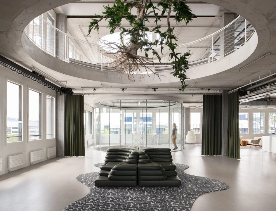 The space is divided into neighbourhoods to provide a sense of community and social context. Each neighbourhood has three floors with different functions and employees can move between focus, social or collaborative areas.