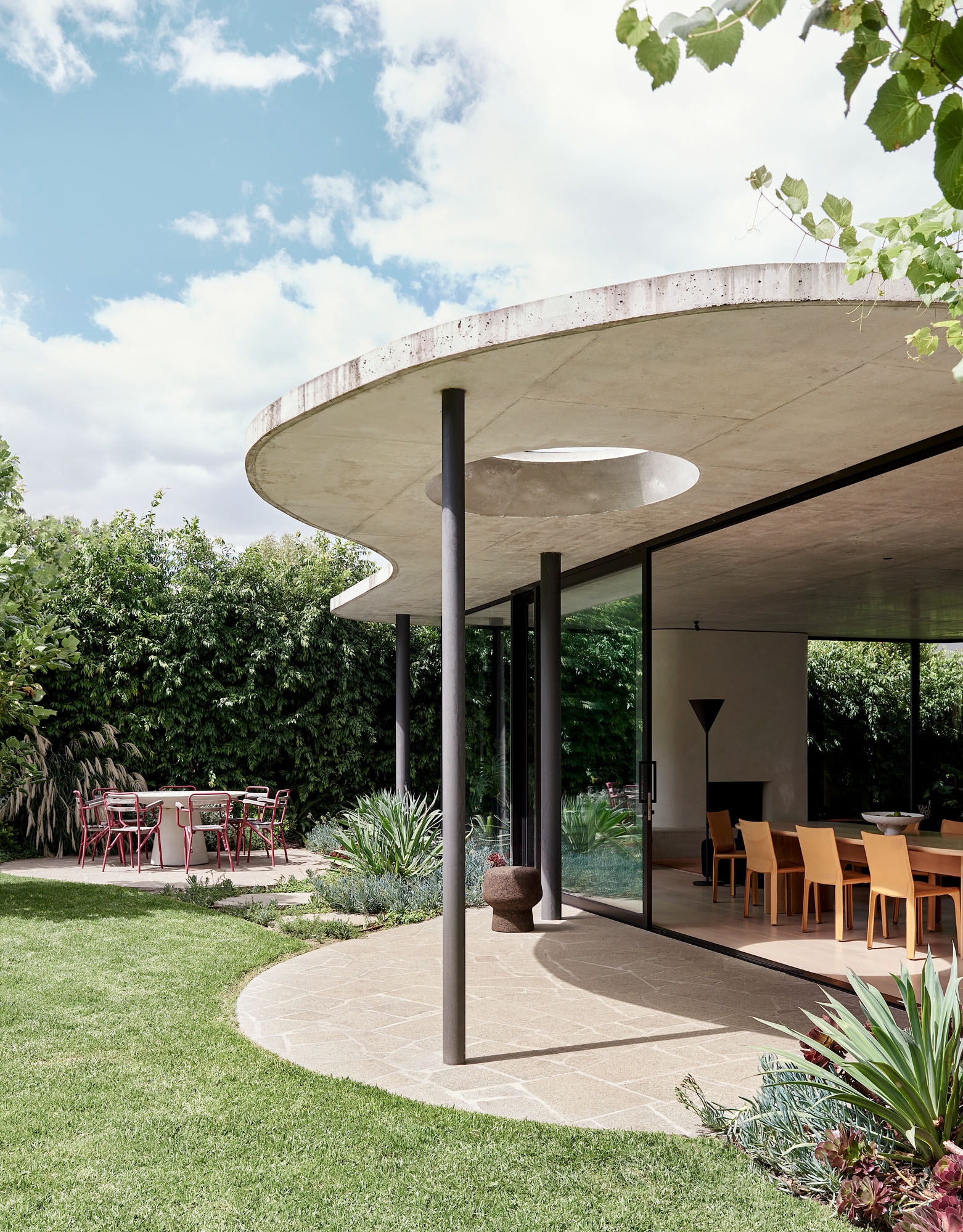 The house demonstrates a progressive approach to architecture through repurposing an outdated building with fluid form. An expressive curved concrete roof and flowing internal planning reimagine the way we live. Large overhangs provide solar protection and frame the landscape beyond. Oculus skylights provide unexpected pools of light into the interior of the extension and frame curated views to the sky above.