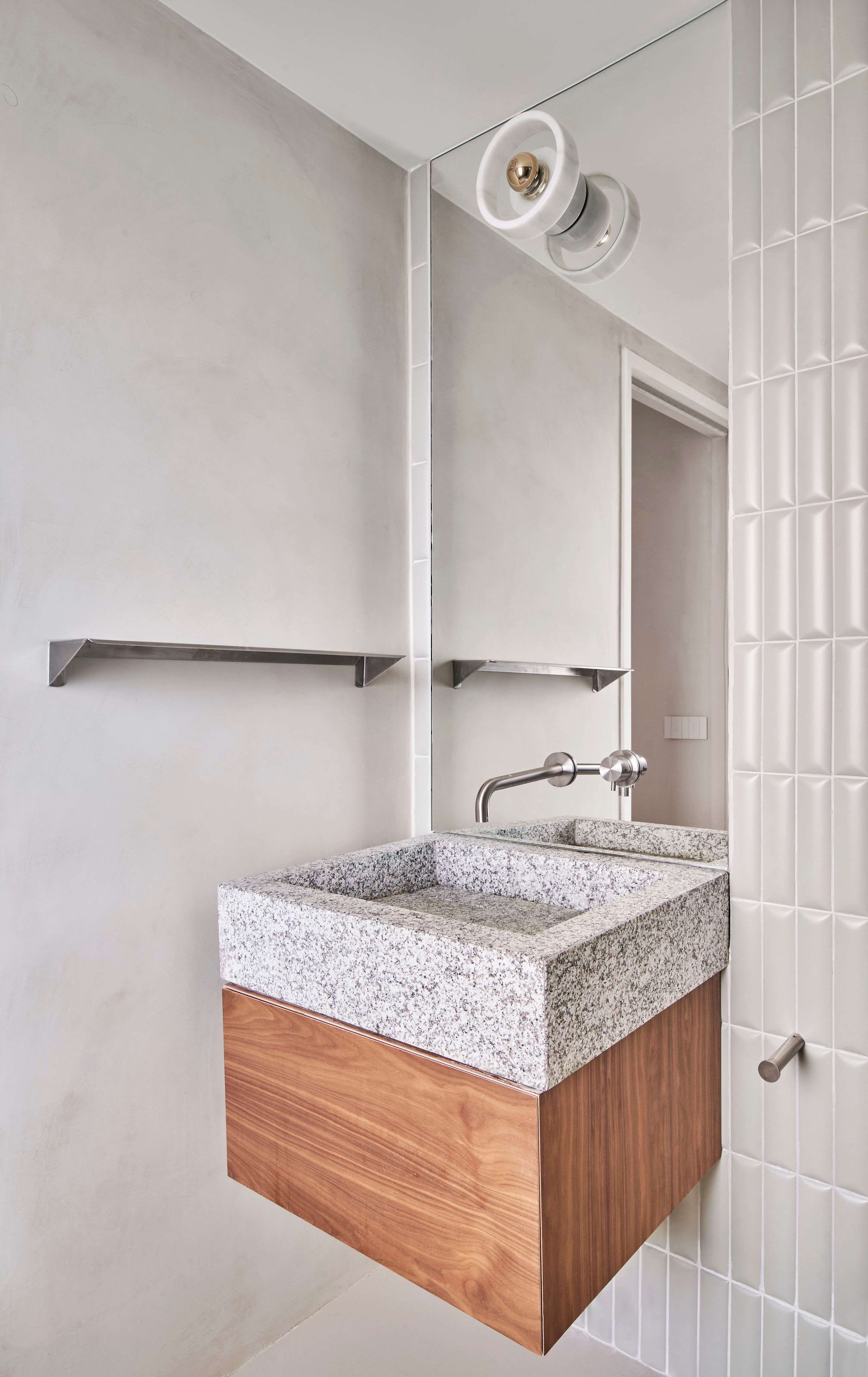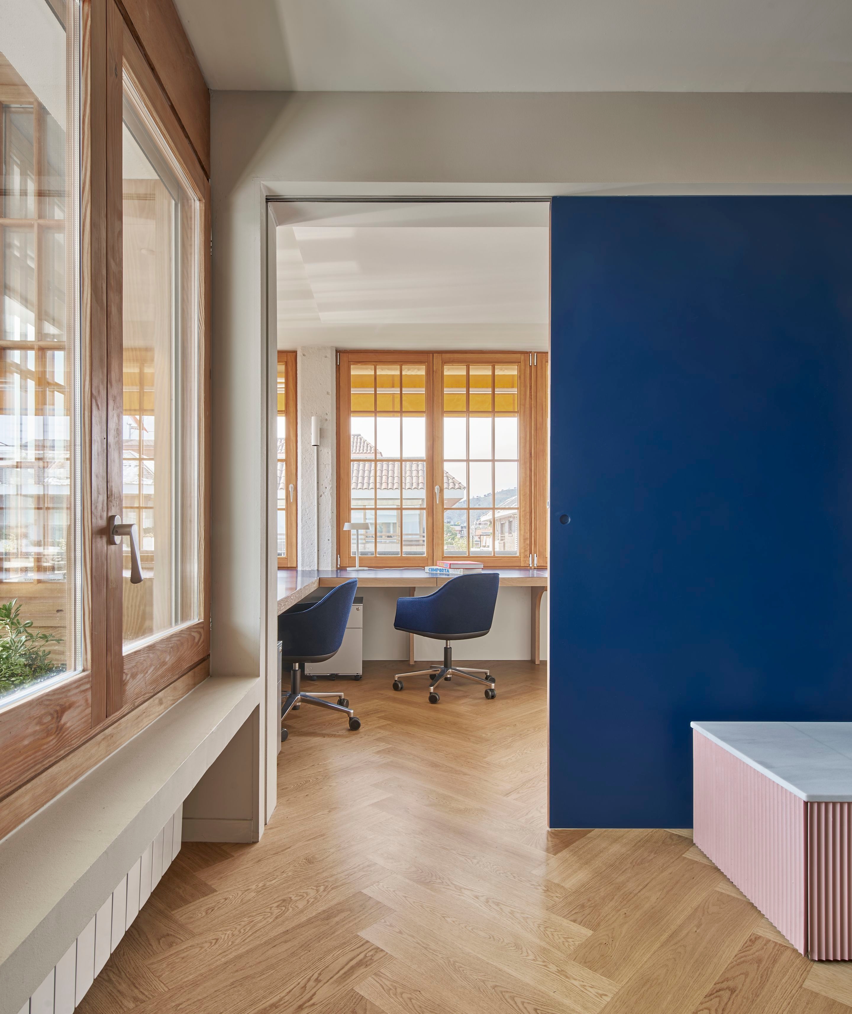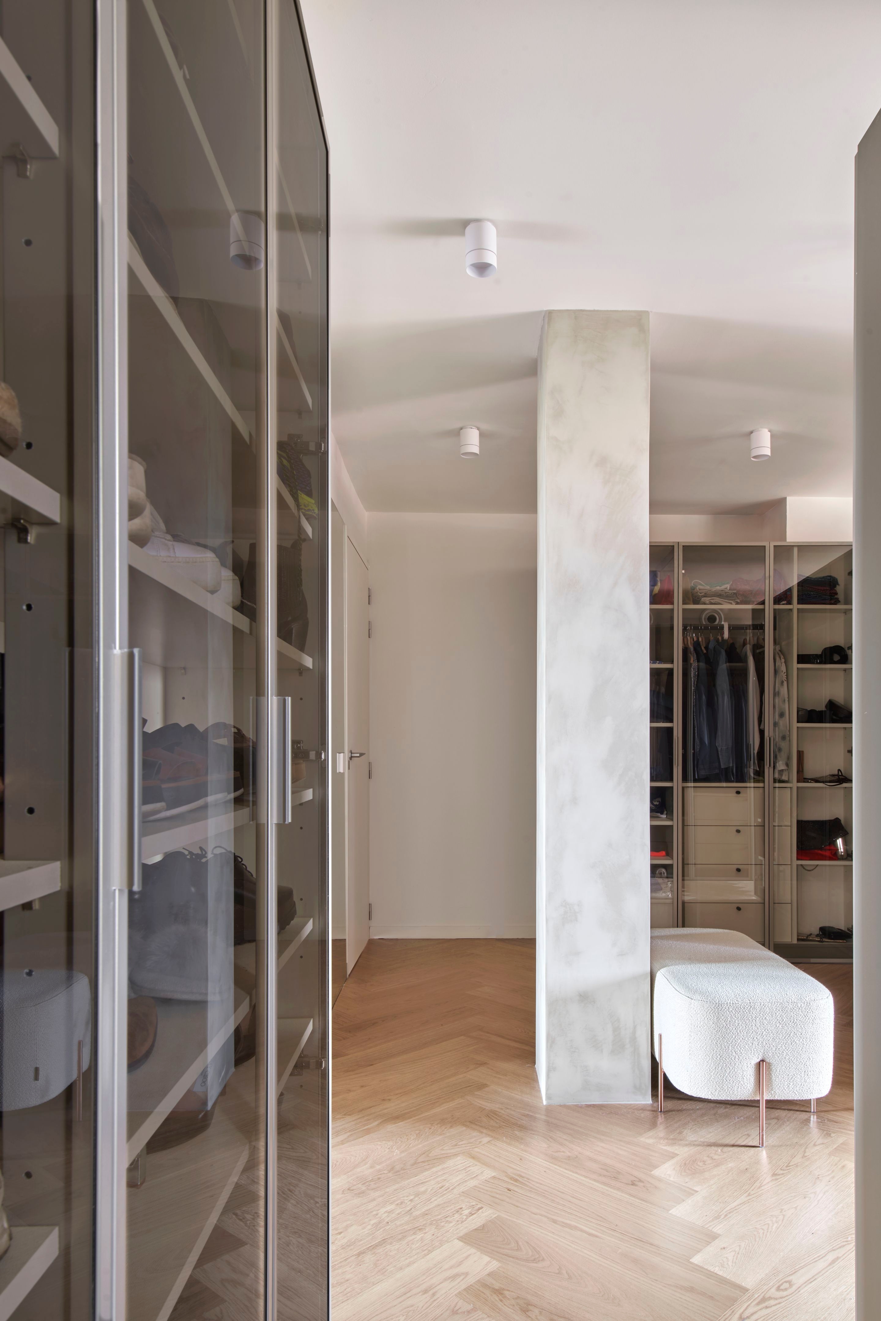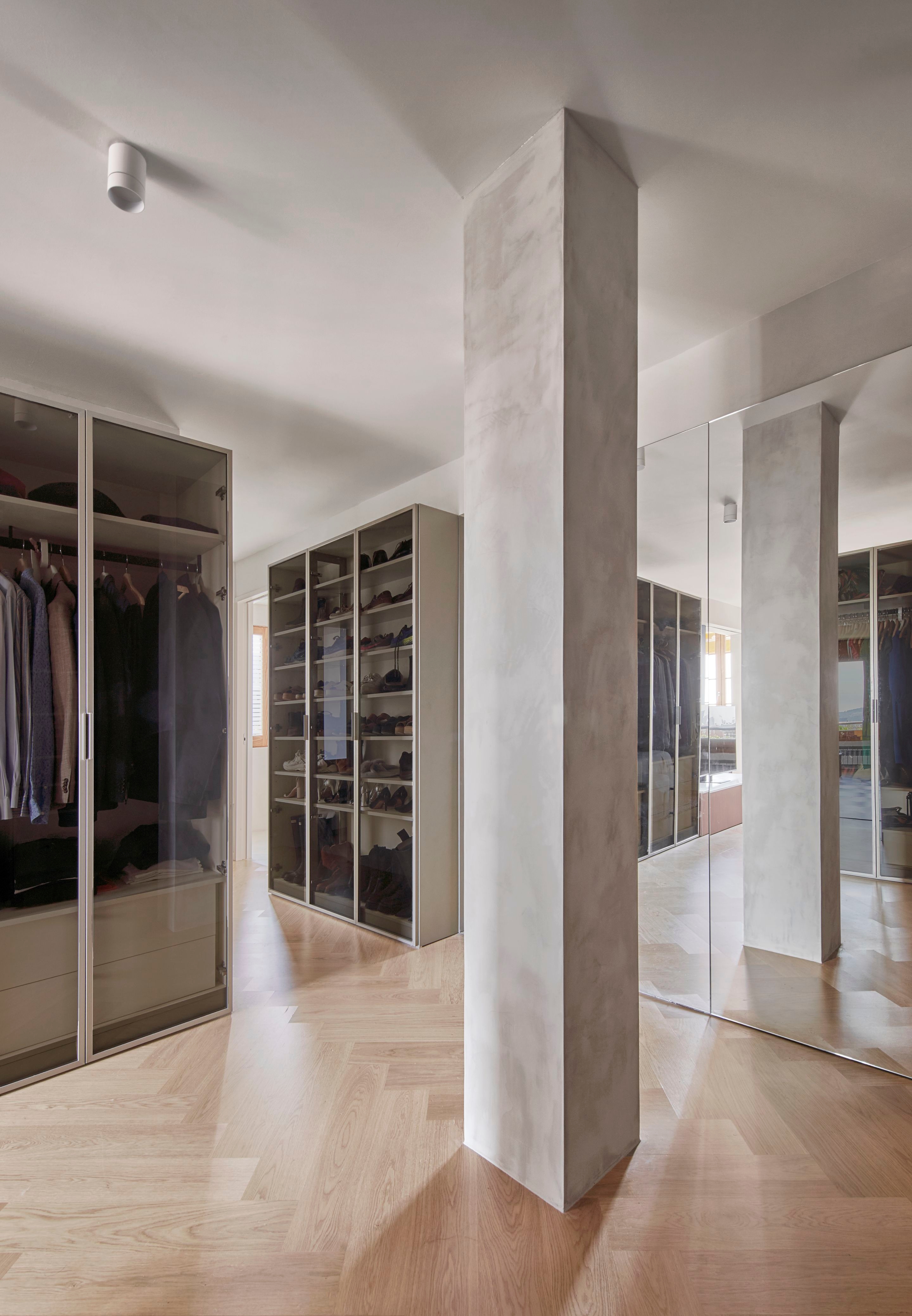 A similar principle of interconnected programs is found within the master bedroom, where the dressing room, bedroom, and study share an open plan, structured only by separate wardrobes and sliding partitions. Large floor-to-ceiling mirrors paired with reflective smoked glass doors create a geometric mirage in the walk-in closet. A mix of powdery and muted palettes punctuated with bold, bold color elements is replicated throughout the apartment, seeking a balanced urban aesthetic in tune with clients' personalities. It was deemed worth saving the wooden window frames, otherwise replacing all finishes.