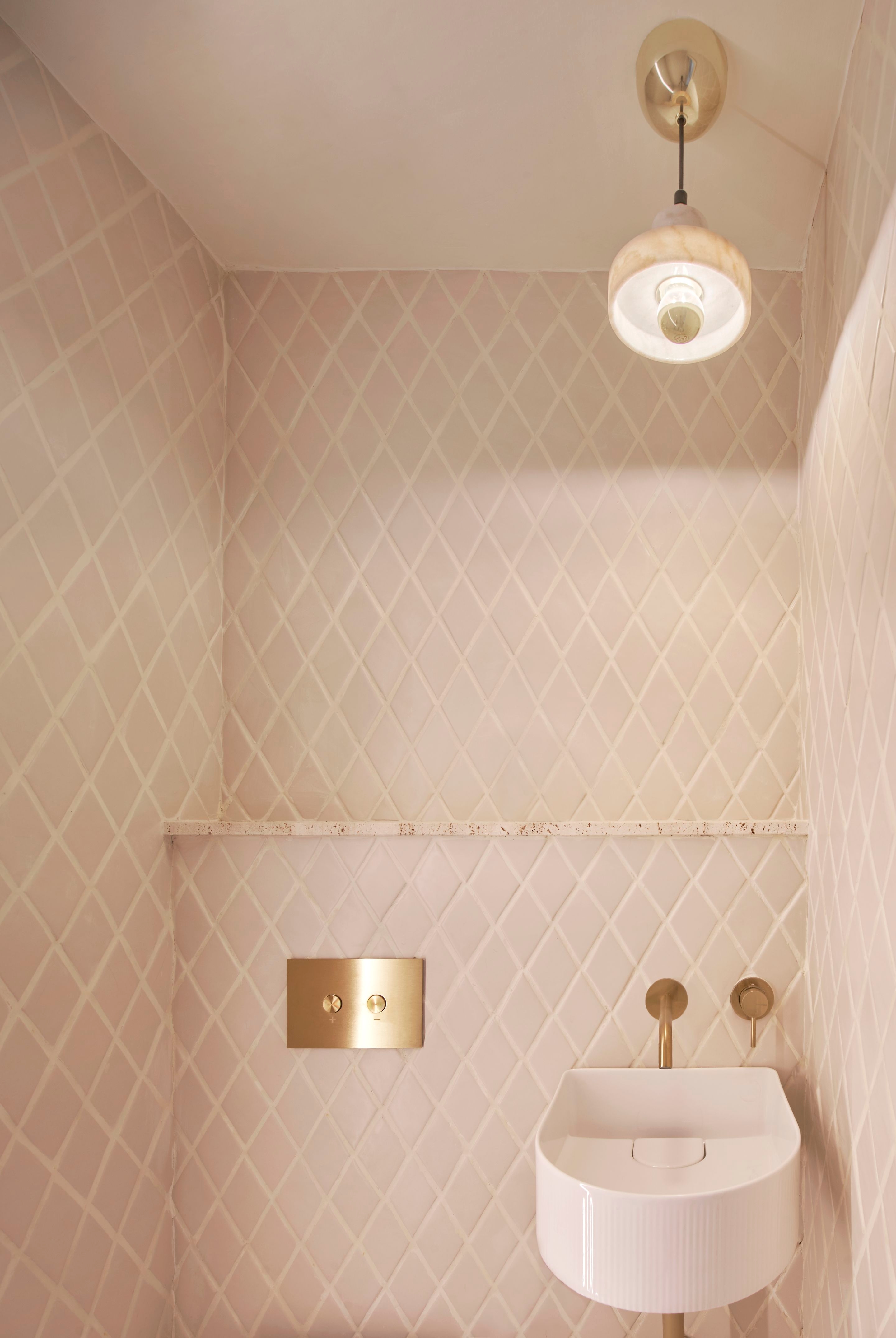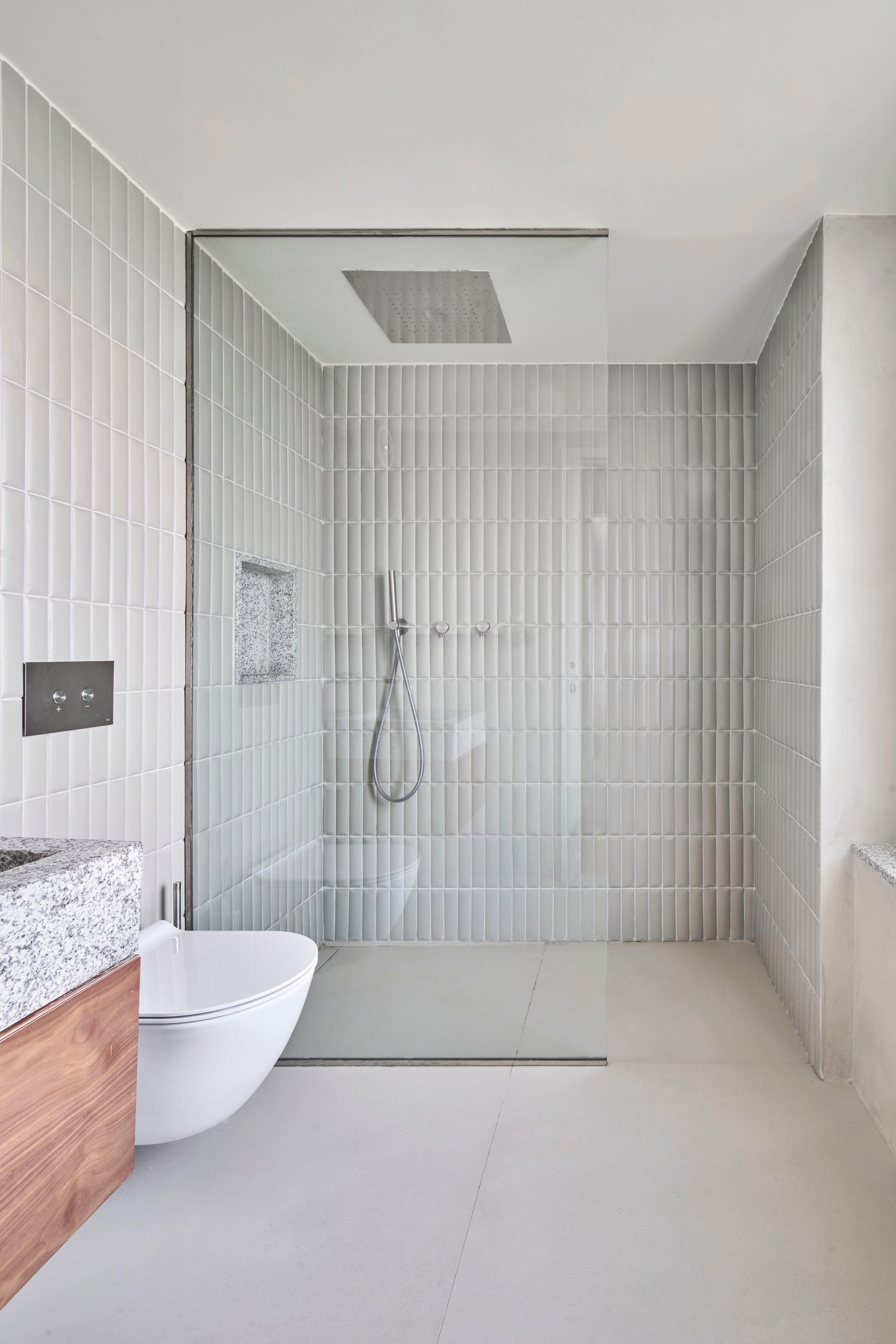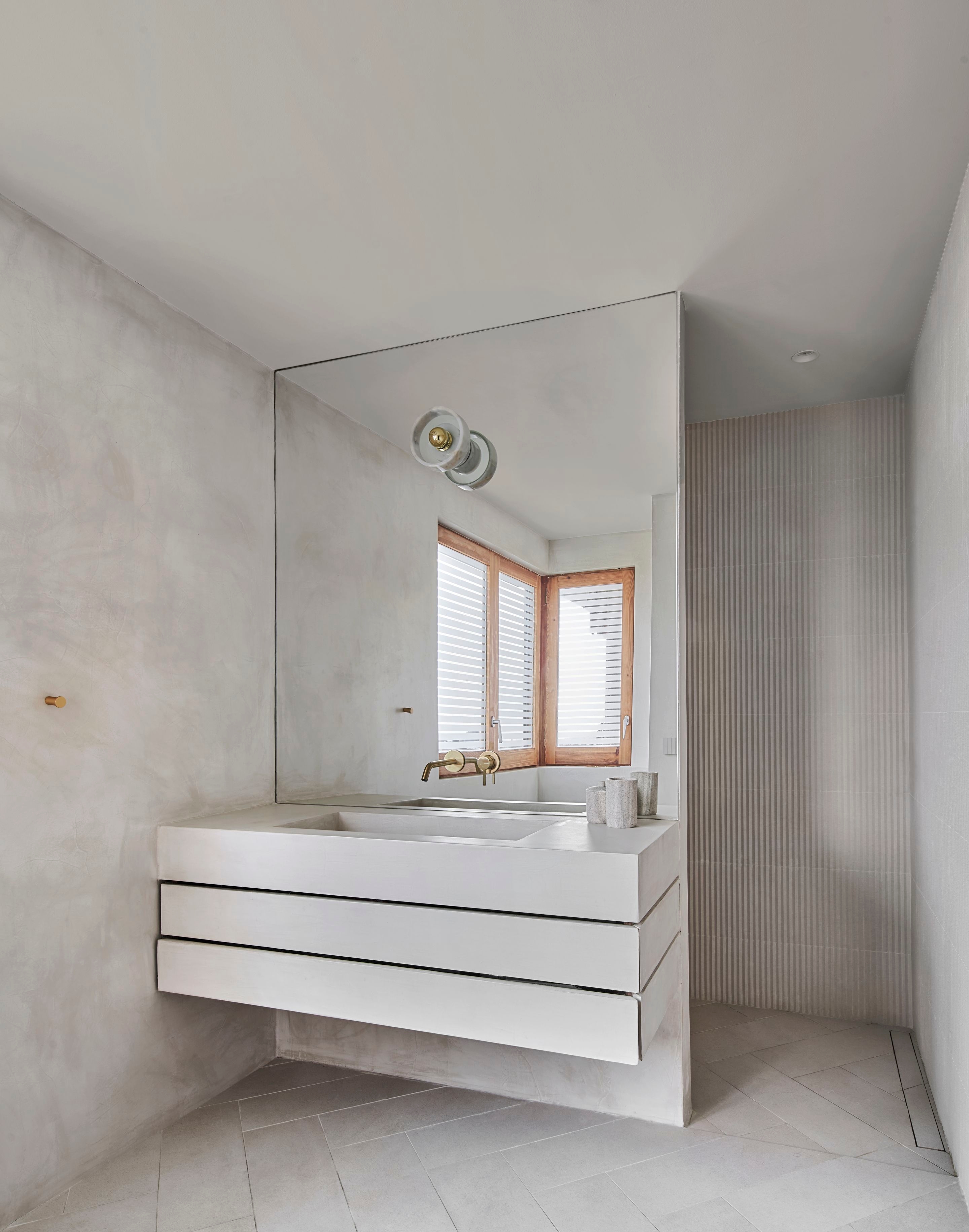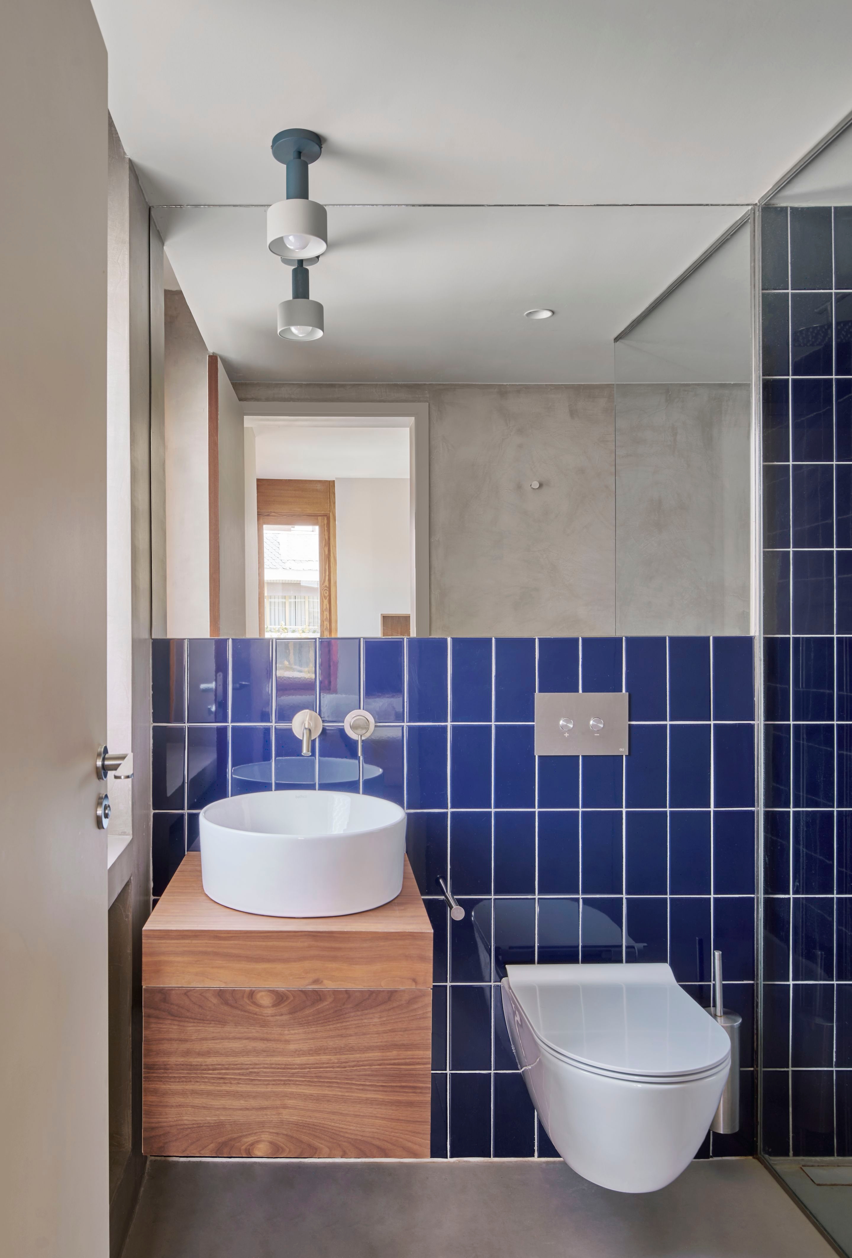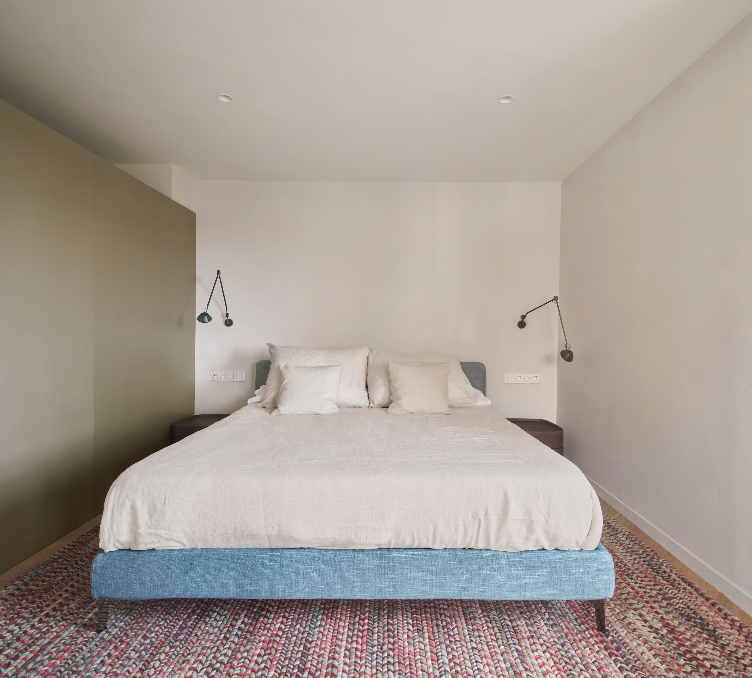 A similar principle of interconnected programs is found within the master bedroom, where the dressing room, bedroom, and study share an open plan, structured only by separate wardrobes and sliding partitions. Large floor-to-ceiling mirrors paired with reflective smoked glass doors create a geometric mirage in the walk-in closet. A mix of powdery and muted palettes punctuated with bold, bold color elements is replicated throughout the apartment, seeking a balanced urban aesthetic in tune with clients' personalities. It was deemed worth saving the wooden window frames, otherwise replacing all finishes.