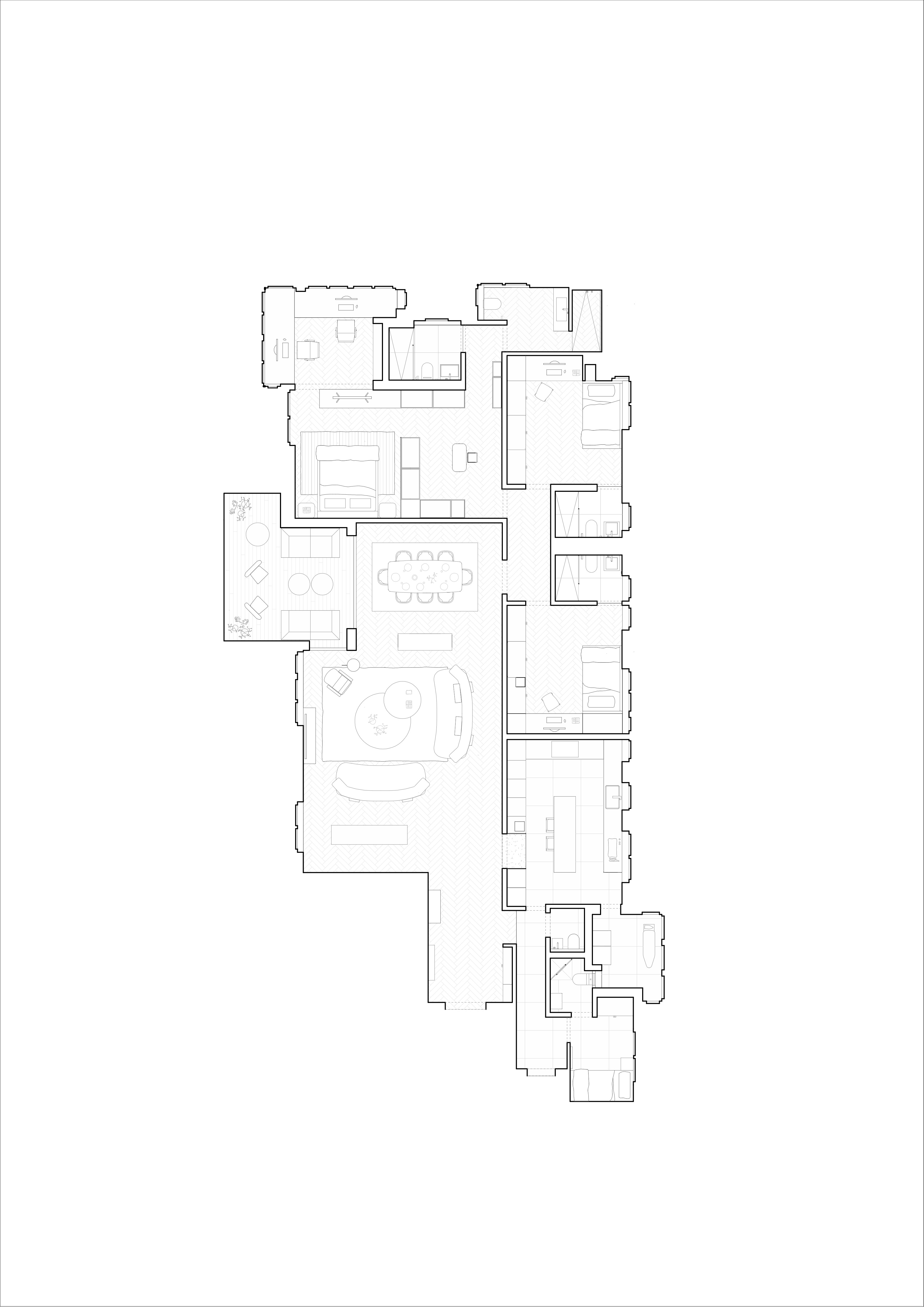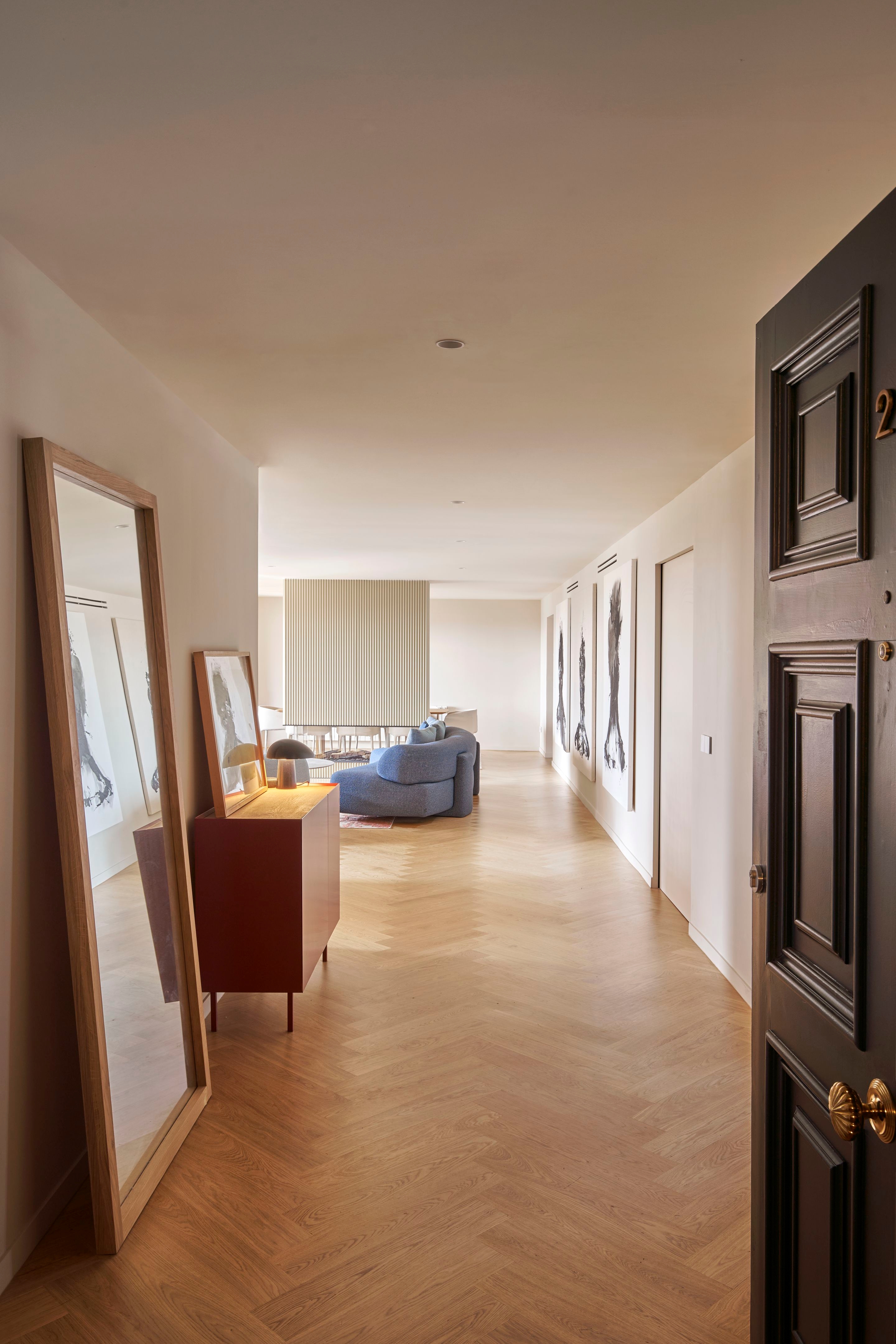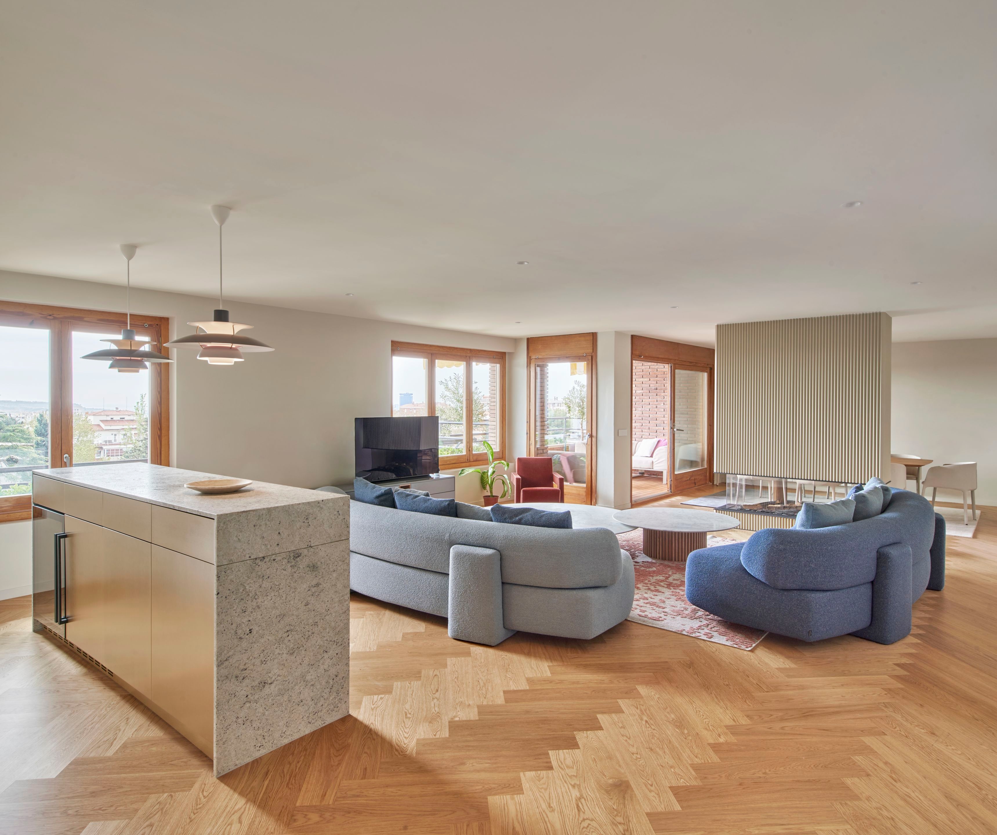 Largely untouched since its construction in the 1970s, this Barcelona penthouse underwent a complete redistribution to suit contemporary open-plan living. The design of the project responds to a modernized approach to a classic building in general and the will to preserve its inherited elegance, all in line with the preferences of the clients. The superfluous partitions are eliminated, connecting all the day areas in a large fluid space, thus preventing corridors.