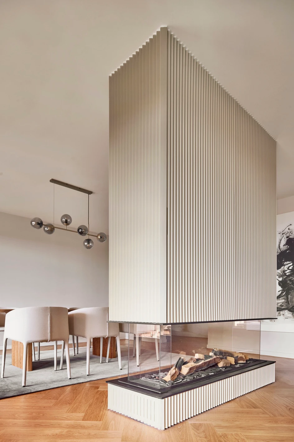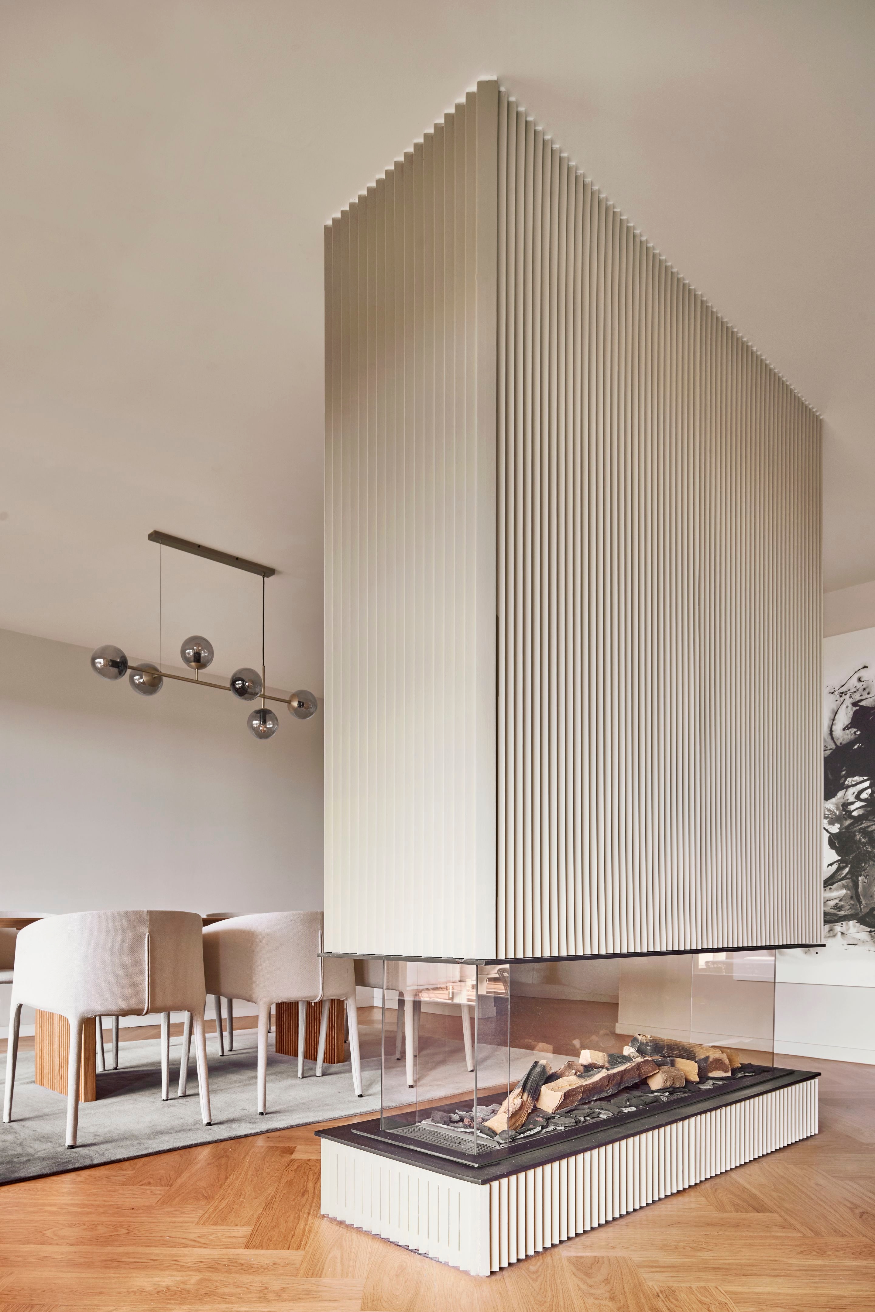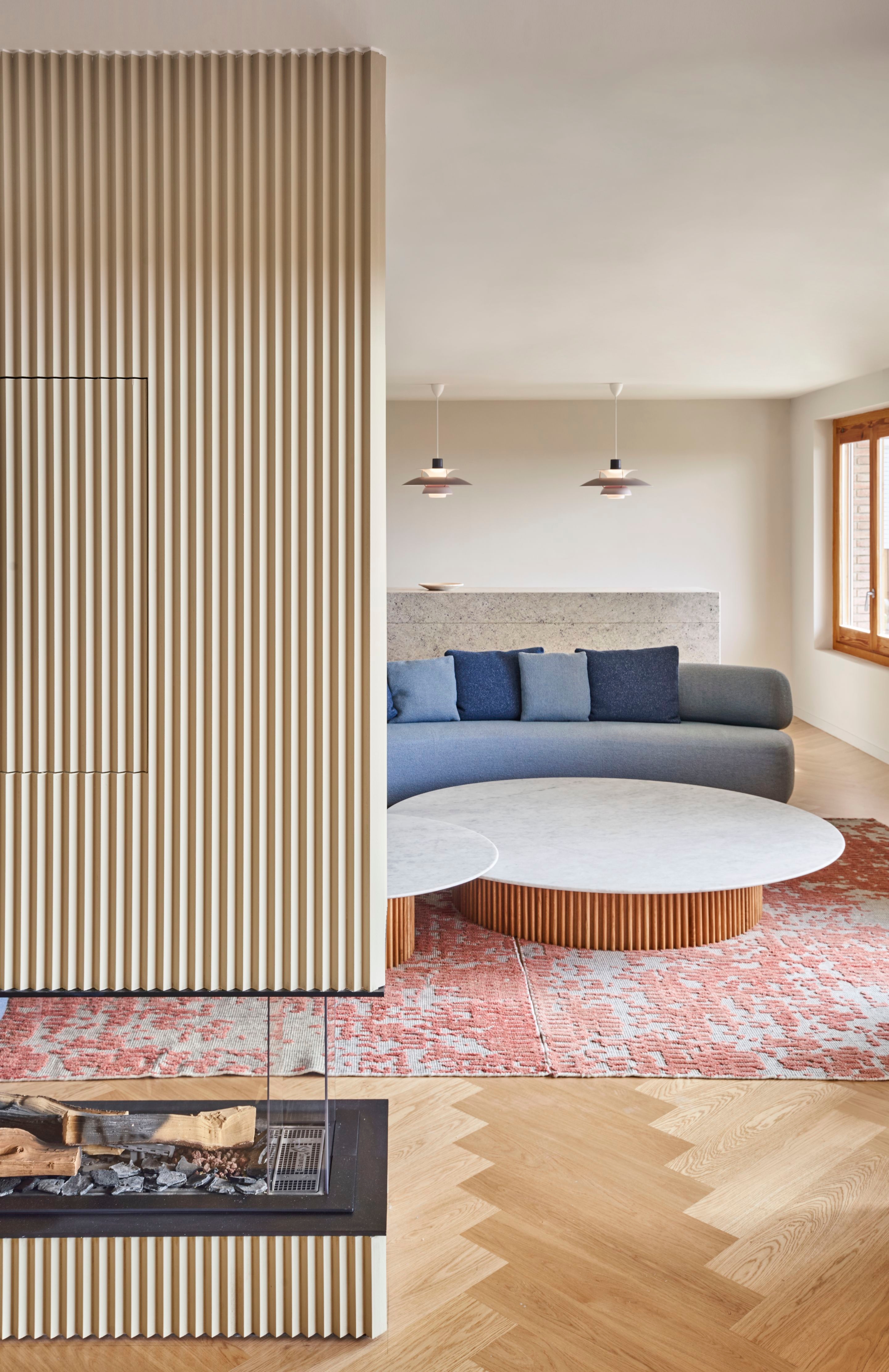Special attention was paid to custom-designed pivot elements that organize the open plan into different settings. A tall granite counter, three oversized marble coffee tables, and a floating fireplace create a sequence of interrelated atmospheres. Each one of them was conceived as a strong monolithic element that claims a spontaneous floating circulation around it. In this way, the old fireplace was detached from the wall, becoming a unique free-standing piece. Its horizontal cut emphasizes the intention to create hinges instead of blocking relationships. The resistance of these components was considered important enough to dismantle the façade and place a marble table with a diameter of 180 cm in one piece.