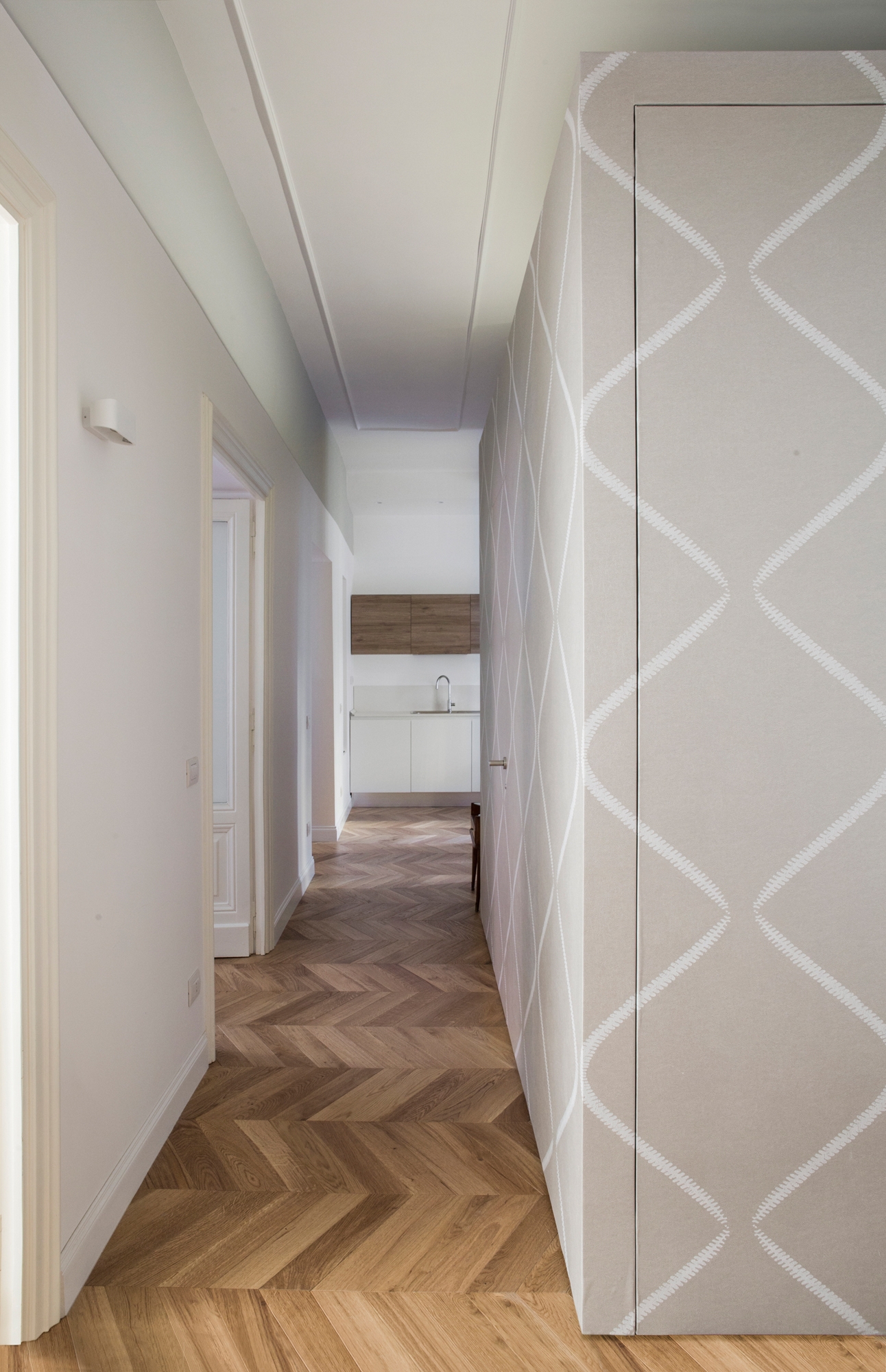 The requests of the buyer were few and simple : to define a second bath and to attribute the characters of a receptive structure potential, apt in the case to accommodate couples in transit in Rome, maybe for a concert or a quick jam session. The saxophone and the voice are the instruments of the Owner, jazz lover, and more generally of all artistic disciplines, lover of the trip, lover of the discovery, but also a lover of simple things, nature, good food, lover of healthy living mainly grown in the small home by the sea in Tuscany, or the frequent use of the bicycle as a means of locomotion. And 'so that between trips, concerts, a canoe ride or skiing in the Alps, the project takes shape: the architectural intervention is minimal and immediately identifies the large entrance area where to obtain the new bathroom. It is represented deliberately as a real intruder, a different volume for position and finish from the rest of the house, ‘floating’ on the warm oak parquet flooring laid Hungarian point detached from the ceiling to let the natural light geometry of plaster cornices and covered with a different skin, a wallpaper design based on macroscopic.