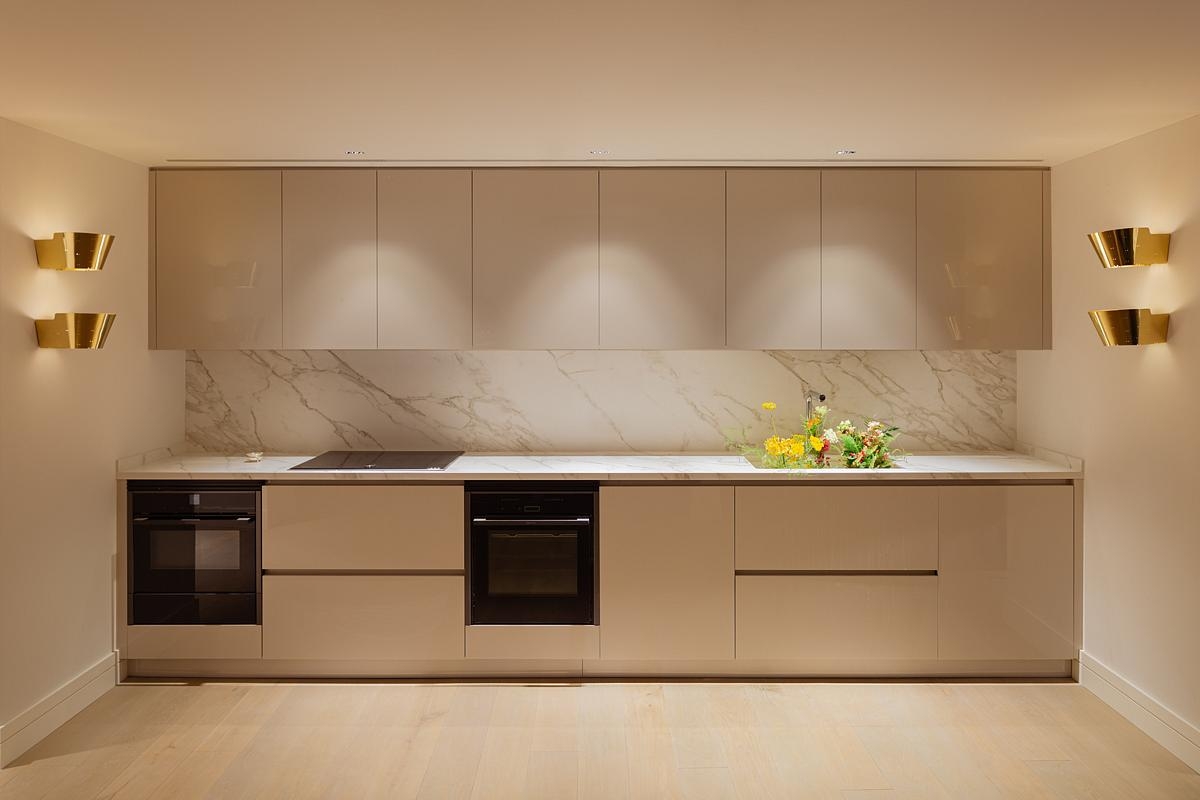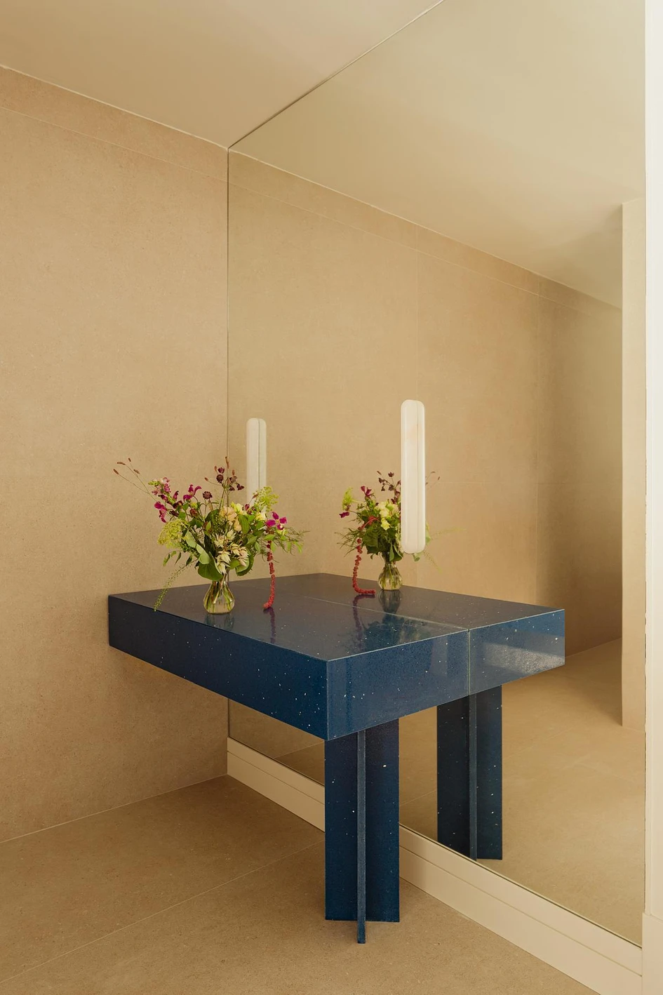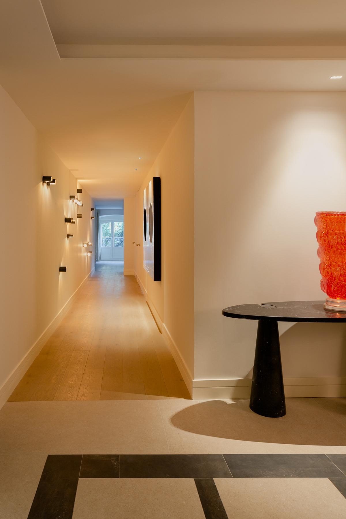 The hallway connects the three bedrooms. We wanted to create a space that was not just for walking through, so we came up with a light installation that eliminates rigidity and acts organically by illuminating warmly in different directions and accompanying people until they reach the living room.