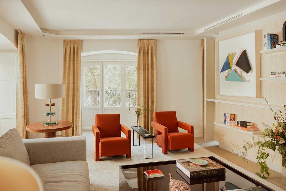 For the living room, we used a series of pieces that bring a great deal of personality to the space, namely orange ‘Utrecht’ armchairs by Cassina and Murano glass table lamps. The rugs in this space are made of wool and silk.