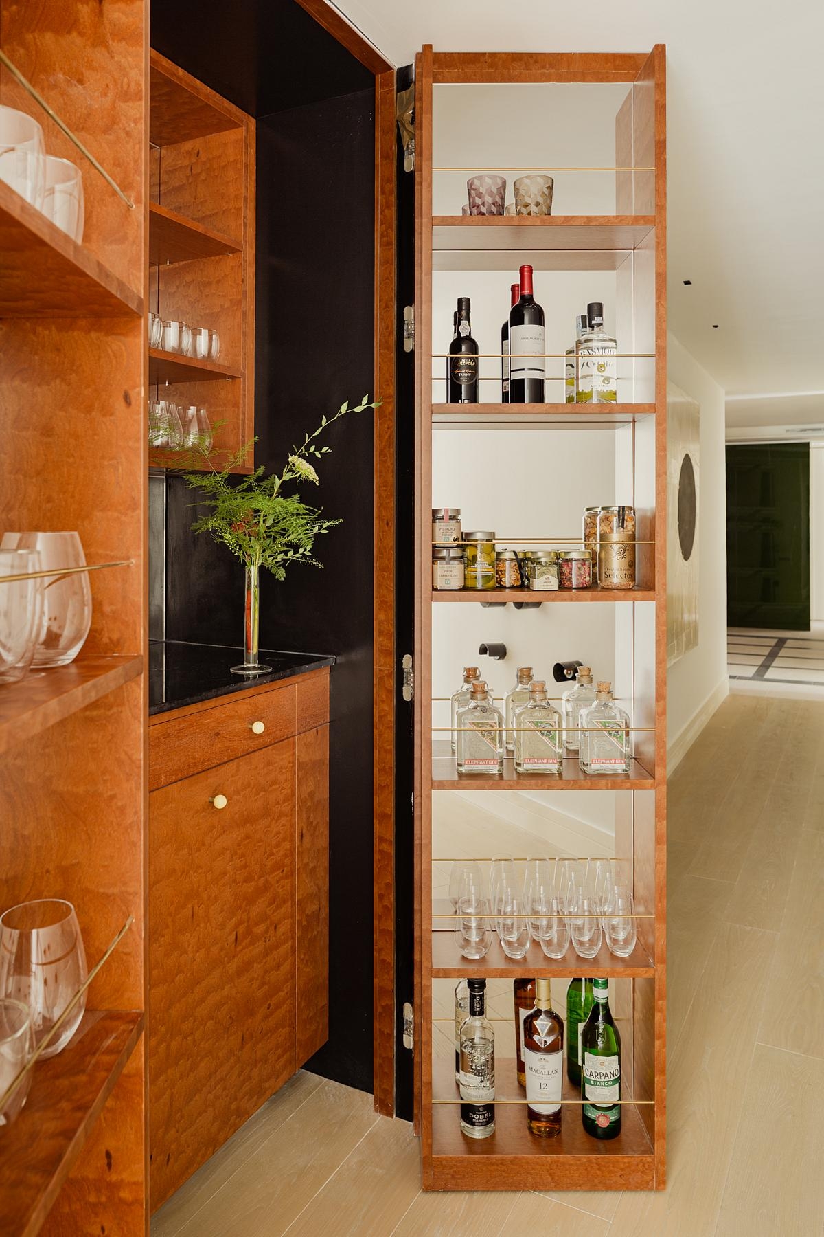 The large entryway displays a checkerboard floor and boasts a specifically designed green-lacquered piece of furniture that delimits the entryway on one side and is used as a coat closet on the other. A 1960s Italian table designed by Ettore Sottsass with a round base, a Carrara marble top and a black metal cylindrical column determines the circulation and makes the entryway more engaging, along with the ‘Eros’ console table by Angelo Mangiarotti.
