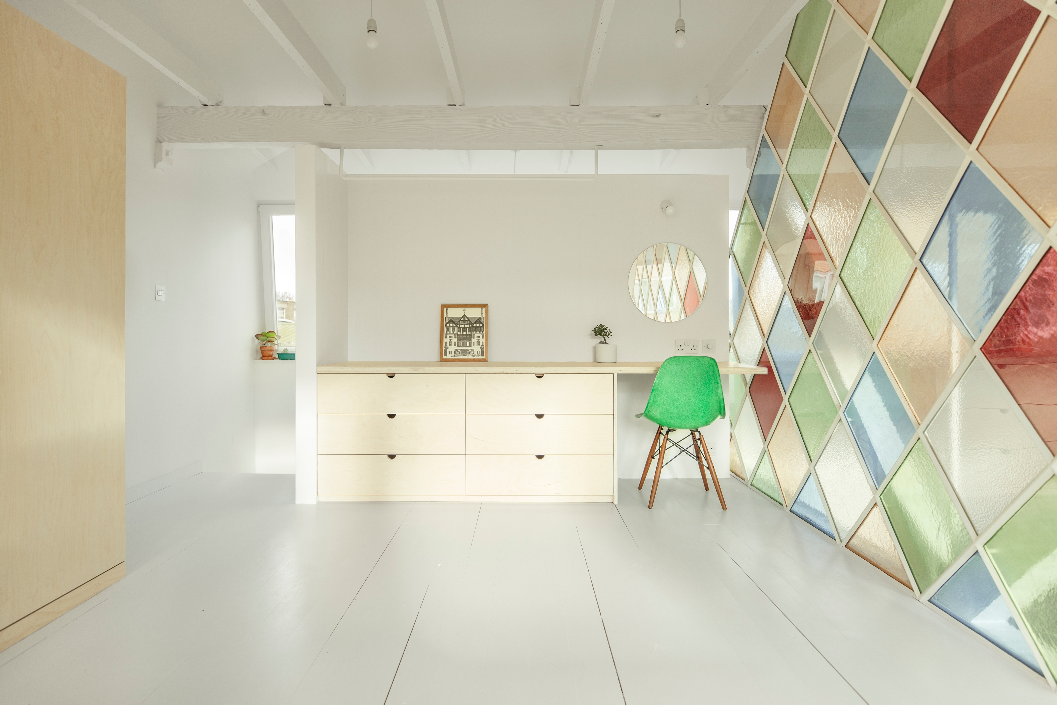 The project brief was to re-purpose the roof space of a former Methodist Church dating from the 1880s into an adaptable space that could be used as a co-working studio in the short term and as a home in the long term. Rather than trying to design a studio that could subsequently be transformed into a home, the approach was to combine both uses in one design. Thus, the space combines the warm materiality found in a home, with the size and flexibility required in a studio.