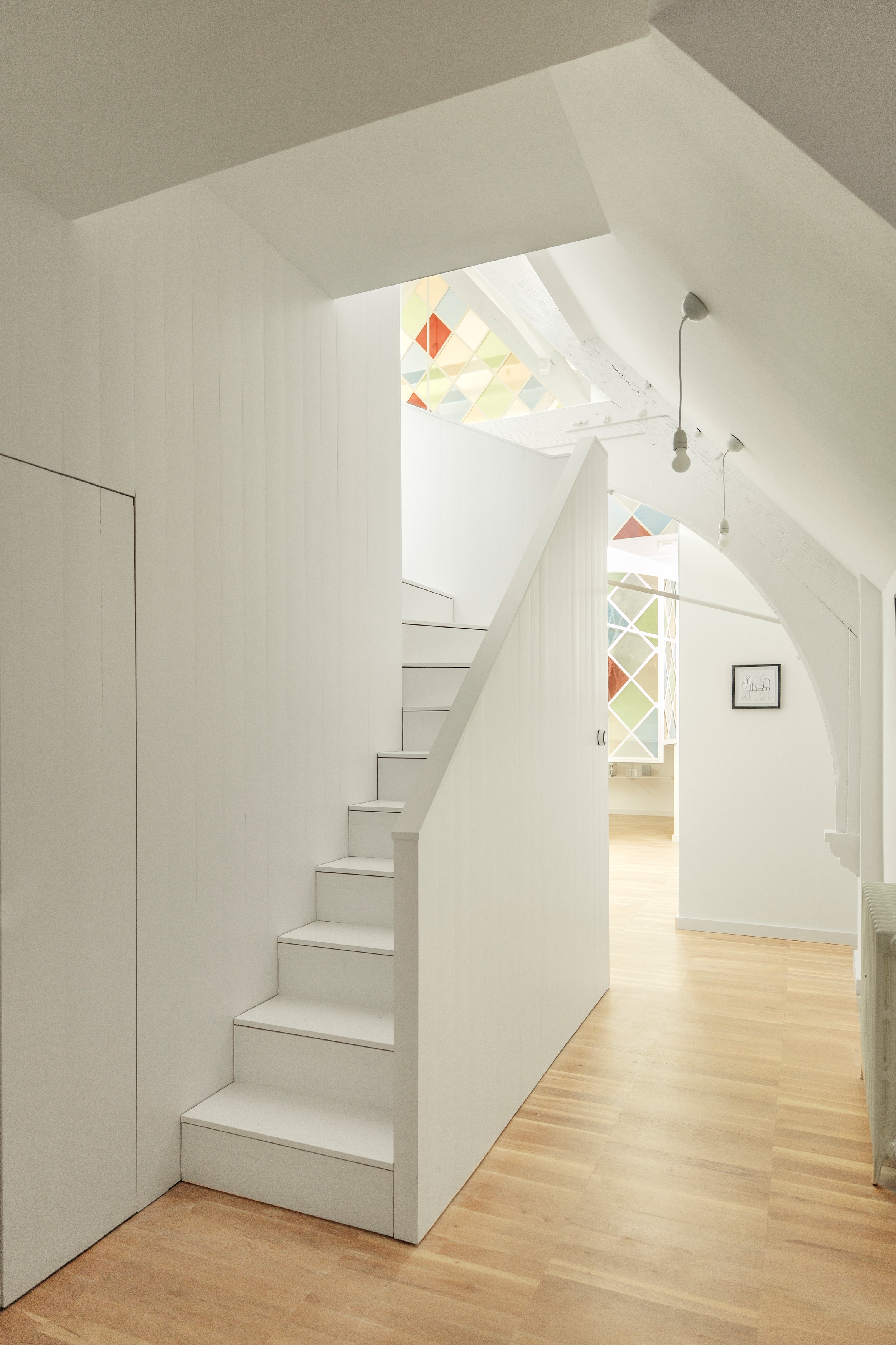 Surman Weston have converted a former Victorian church into a home and coworking space featuring a striking stained glass screen and delicate suspended staircase.