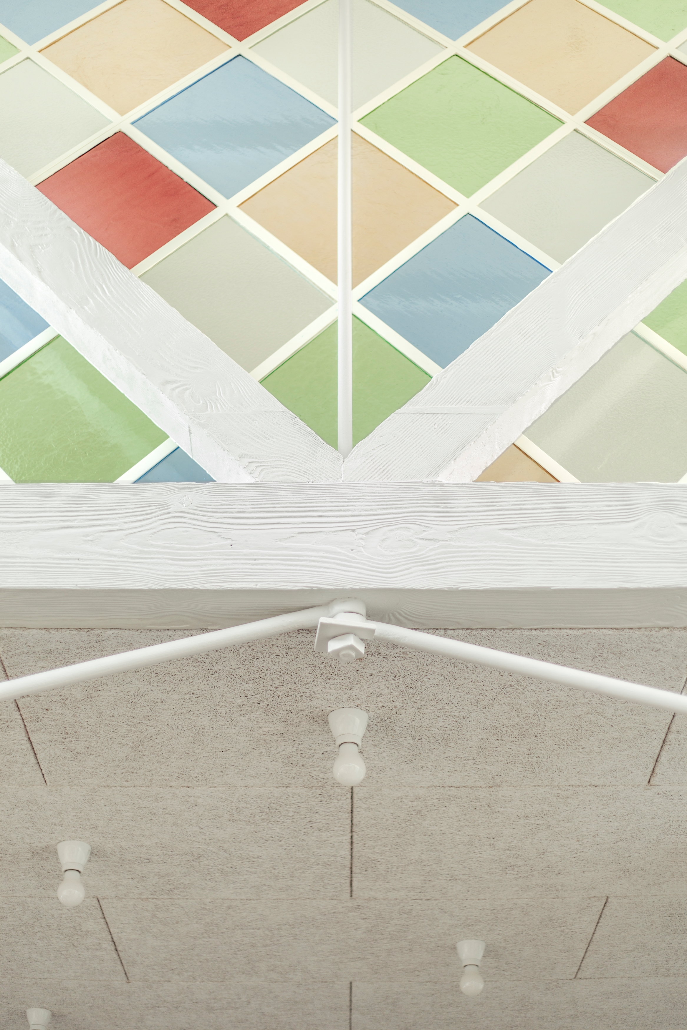 The aesthetic of the project was derived from the existing timber trusses. Sandblasting to remove the many layers of paint applied over the last 130 years revealed the remarkable texture of the original timbers. This led to the idea of creating a canvas of textures, all in white, against which the colourful stained glass elements are offset.