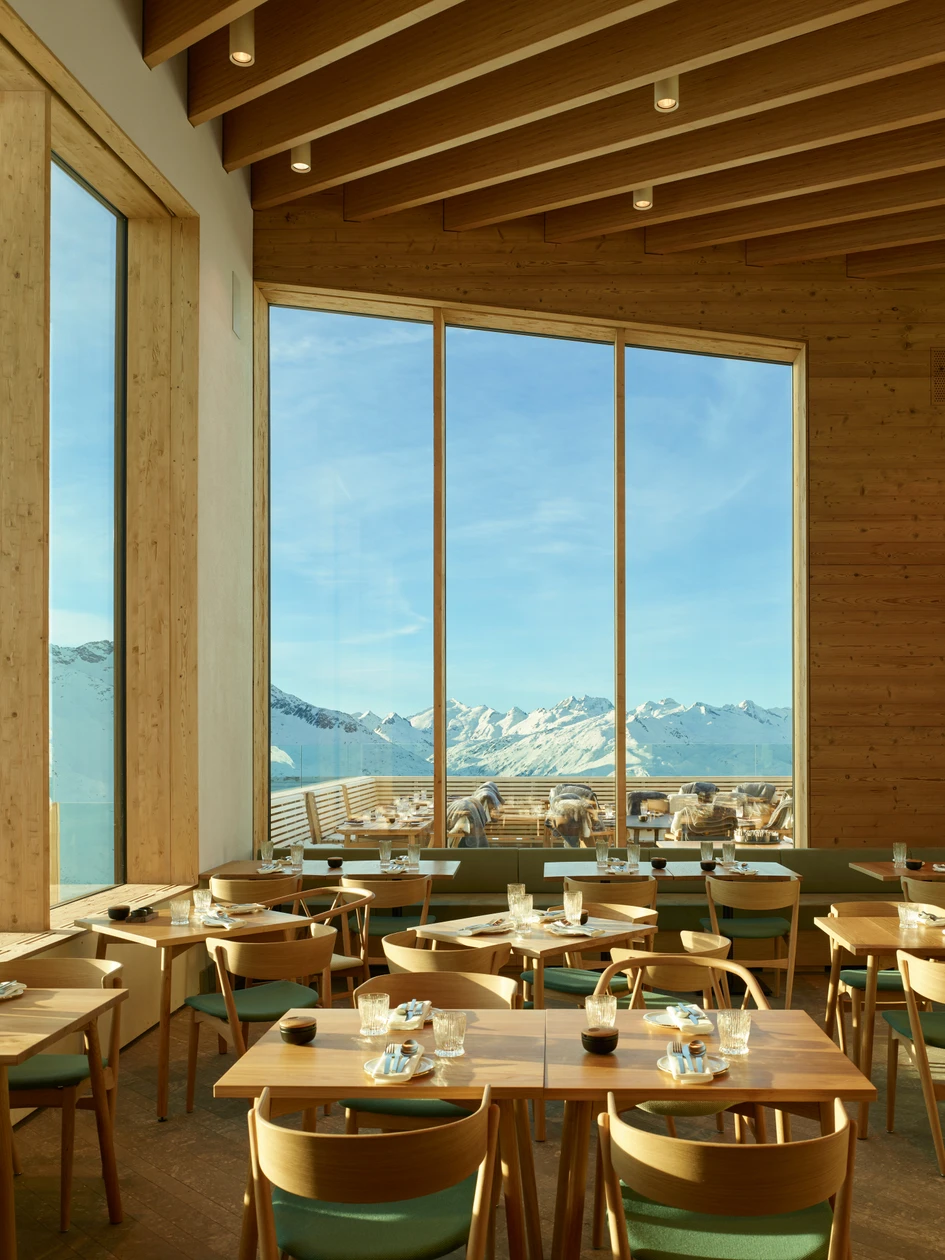 The restaurant is made up of several pitched volumes sloping upwards with large windows opening up to the views beyond. It caters both for the aesthetic and the climatic challenges of a unique site and wide openings offer panoramic views over the valley of Andermatt.