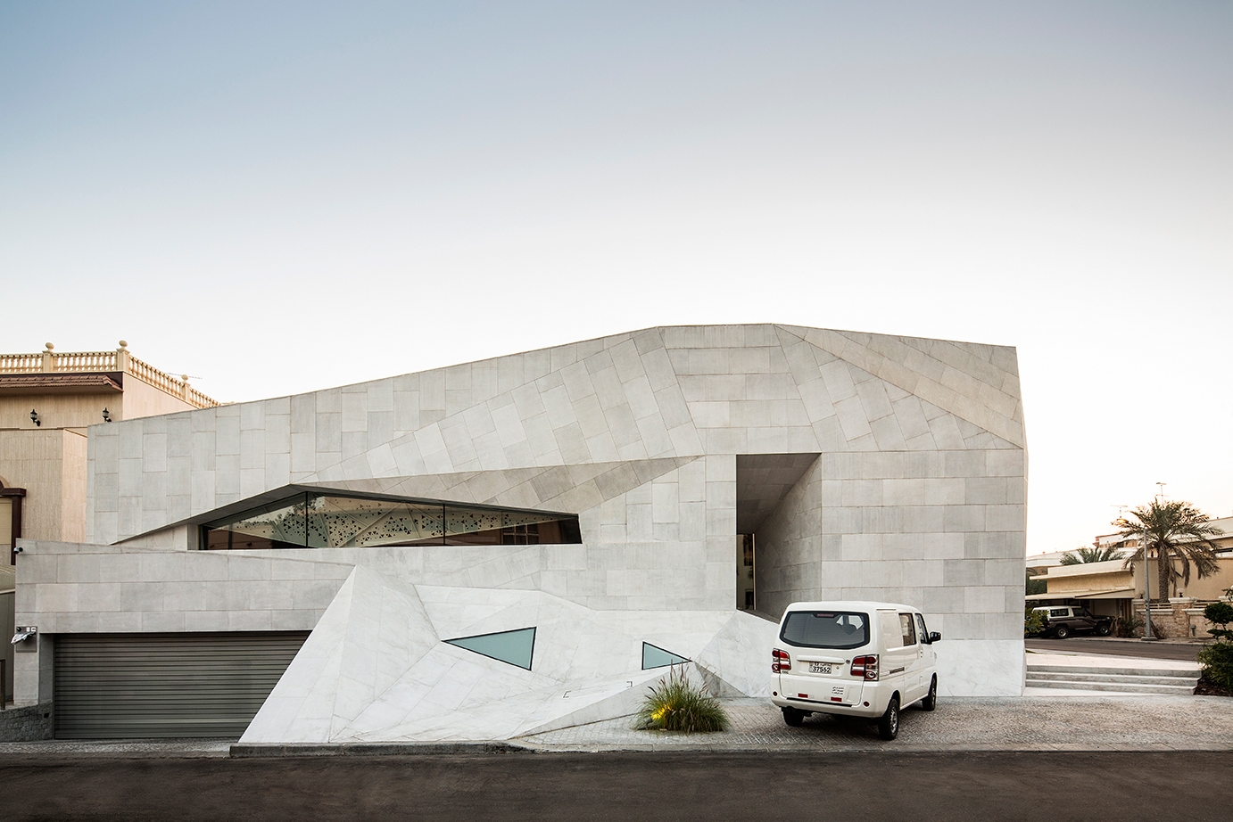 This single family house is located on a corner plot of the residential district of Abdulla Al Salem, Kuwait. The concept stems from a controversial duality imposed by the clients need for complete privacy as well as the desire for distinguishing the house into an iconic building from within the neighborhood. The buildings’ structure is composed of reinforced concrete formed similarly to a folded origami, and the structure rotates around itself creating a central courtyard from which all the spaces in the house are turned towards.