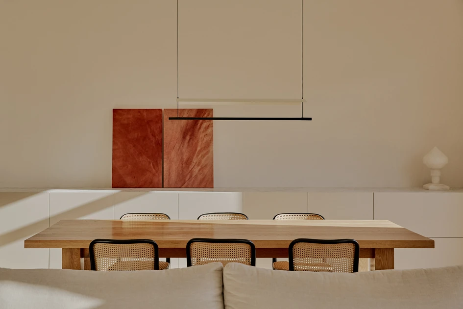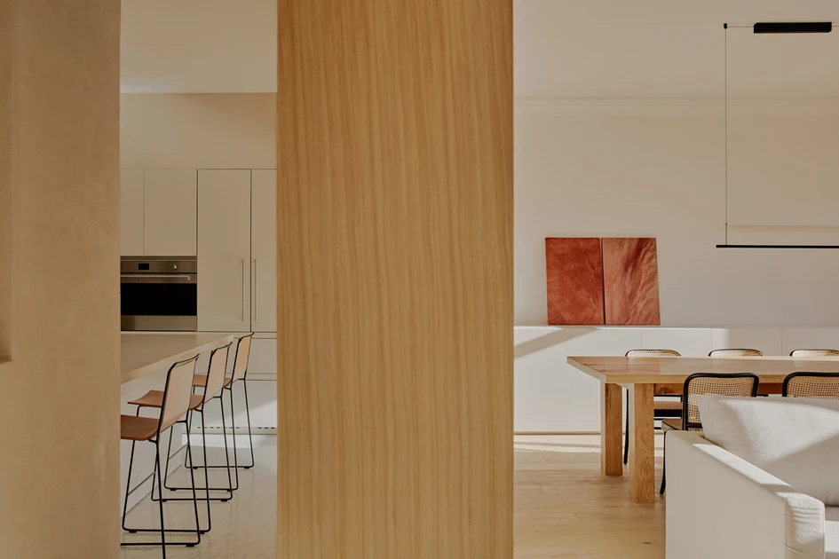 The house uses the large hallway’s depth to accentuate the compartmentation between areas. Again, with the help of light, materiality and colour palette, the user can oversee the mood alterations throughout the Serial Vision Home. In the first half, areas such as the living and dining room come across as active for their brightness and, from this point on to the night area, spaces change in colour one after the other to help understand their role.