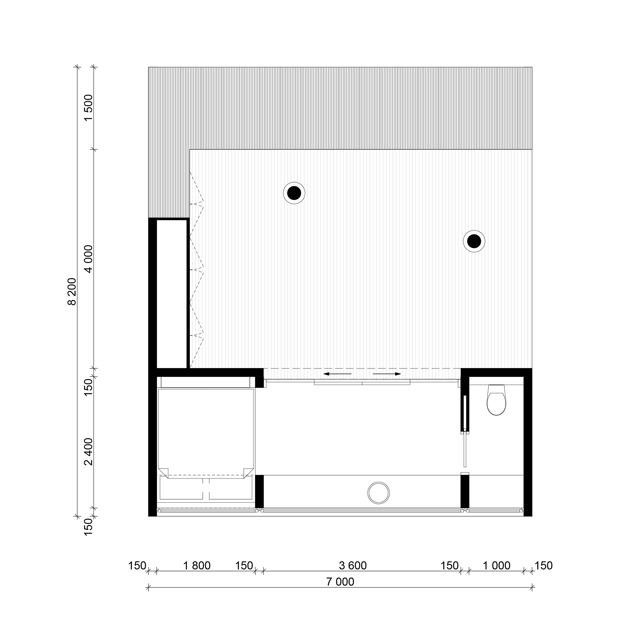 «How can we get the most out of this project?», was the question Saunders and his colleagues had in the back of their minds when they first sat down to draw the extra and outdoor guest room that the client wanted. They worked with the premises given by the site, and that meant preserving the old, existing plum trees in the garden. As a result the plum trees now grow through the triangular building, undisturbed. The contrasting colors of the black exterior against the white interior helps giving the impression of the building being «a slice» in the garden.