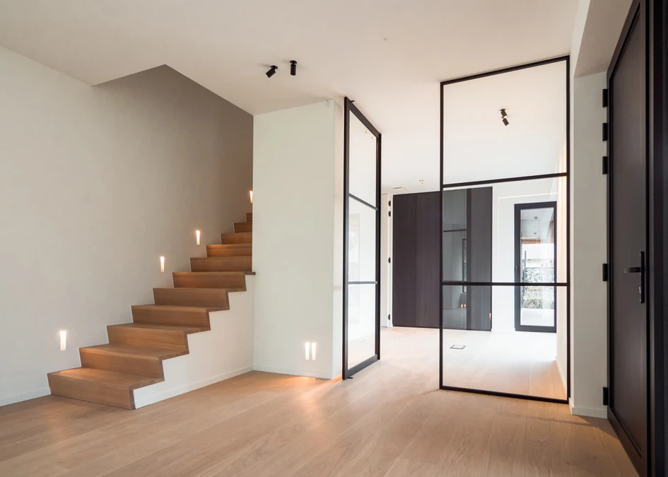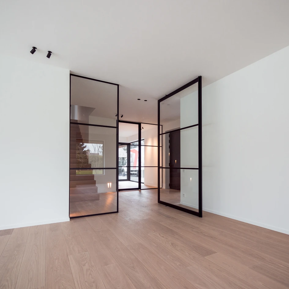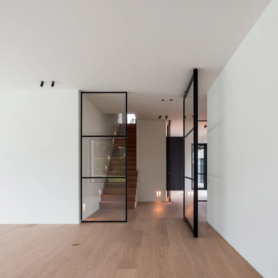 Our local partner The Doors Brugge used Portapivot 6530 pivot doors & Portapivot 3030 fixed glass partitions in this beautiful villa by the sea at Knokke-Heist in Belgium to create "steel look" separations between the hallway and the downstairs living and home office areas. The client desired an elegant separation system that nicely matched the black lighting details in the home. Everything is installed in the final phase of construction. With Portapivot there's no need to pre-install anything in advance since the hinge technology is fully integrated inside the door panel.