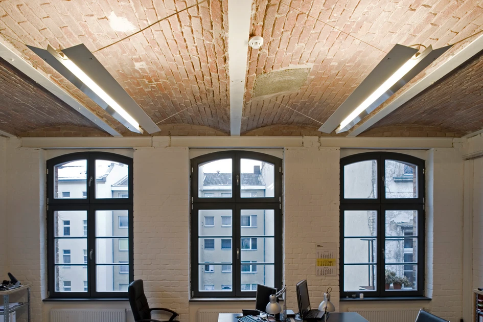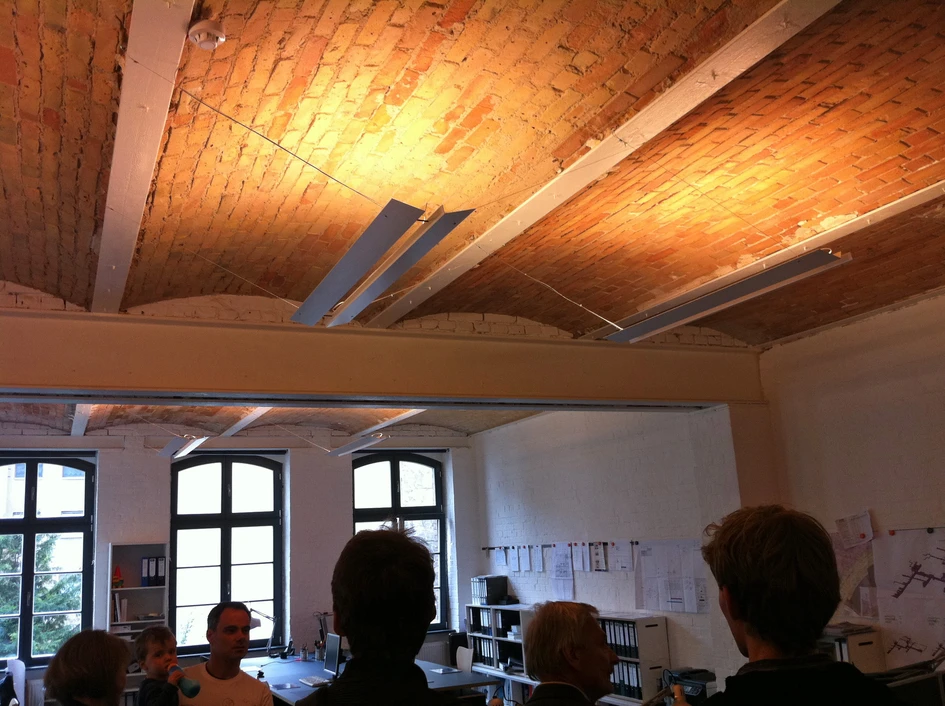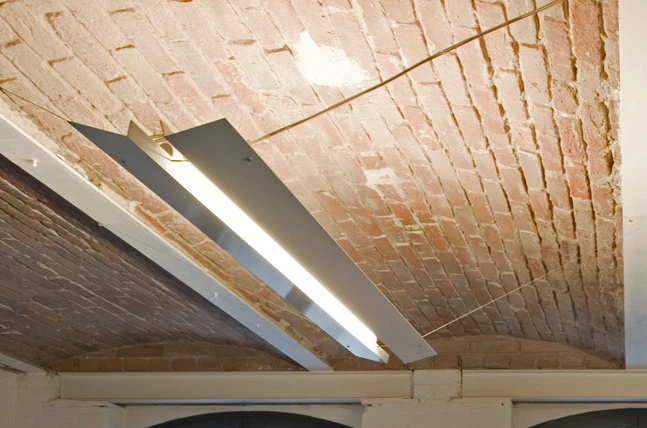 Simply made from standard aluminim profiles, it adapts to the room with its unusual hanging an illuminates the classic prussian vaults to create an indirect lighting.
