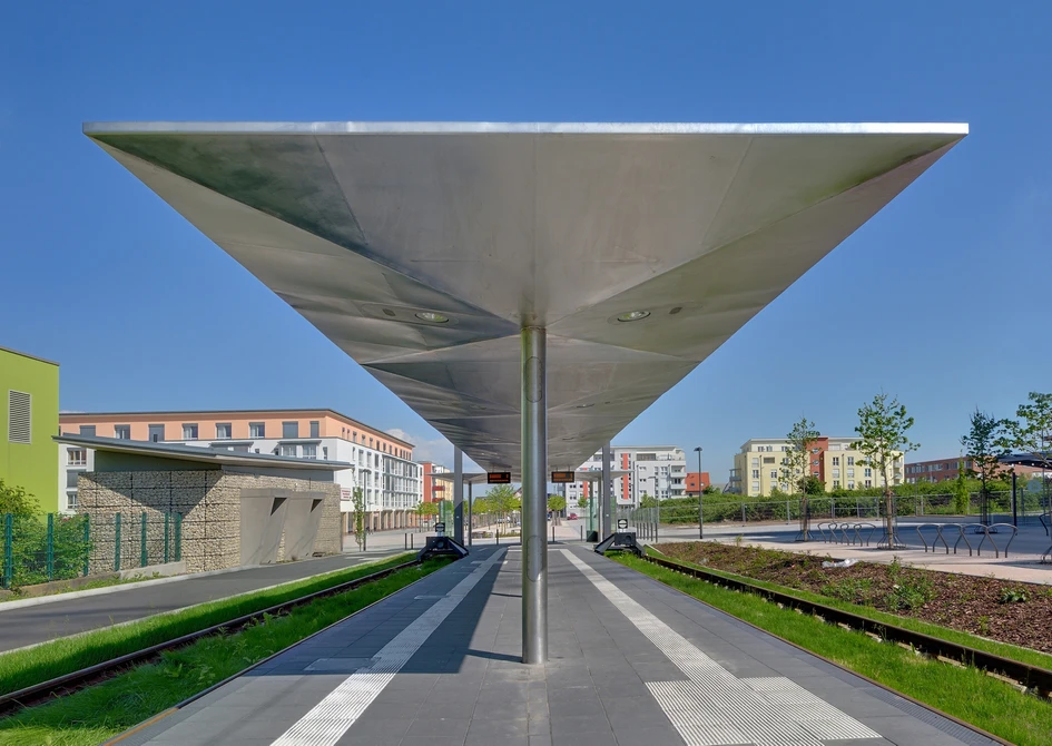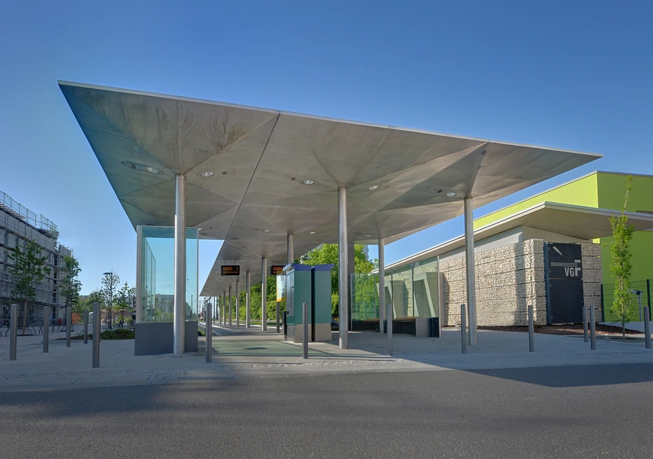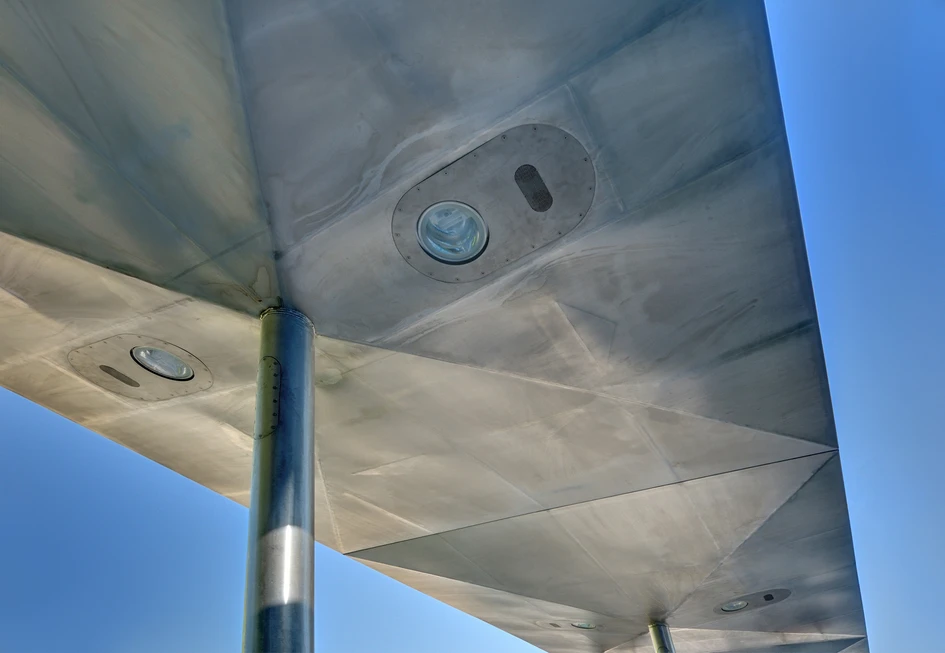 The main interest of the architects was to create a thin, quiet and consequently elegant structure whilst maintaining all the necessary budgetary needs, functionality and robustness. 12 stainless steel roof elements consisting of upside down pyramids lie on thin stainless steel columns. All the neccessary elements such as lighting and speaker fixtures are flushly integrated into the descretely folded roof structure, emphasising the appearance of the wing of an aircraft.