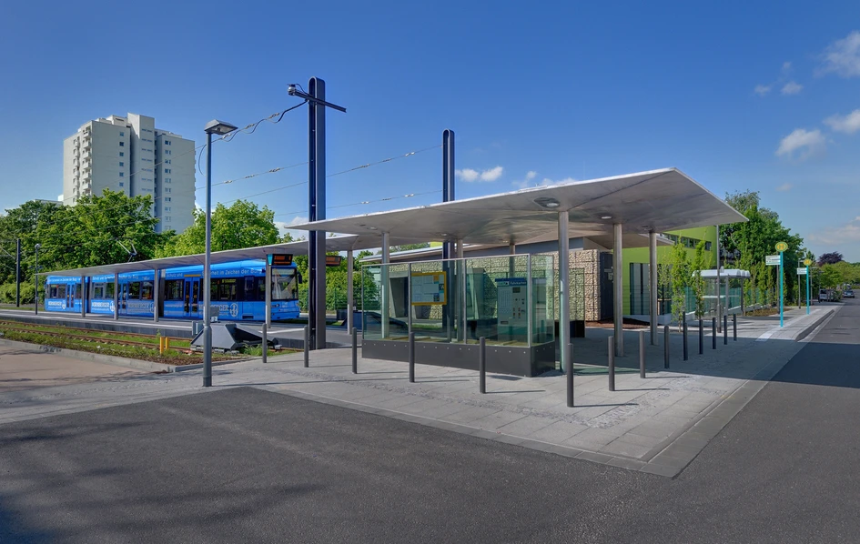 The architects had to work with a very narrow platform (only 4 m) on which - due to the neccessary passage widths of 2 m on either side - no furnishings were possible. Consequently the waiting area with seating possibilities and weather protection is located at the end of the platform under the wide area of the roof structure. Apart from purely functional features such as protection from wind and rain, waiting areas have to have a high sense of orientation, whilst being easy to maintain and keep clean, all the time being completely vandalproof.