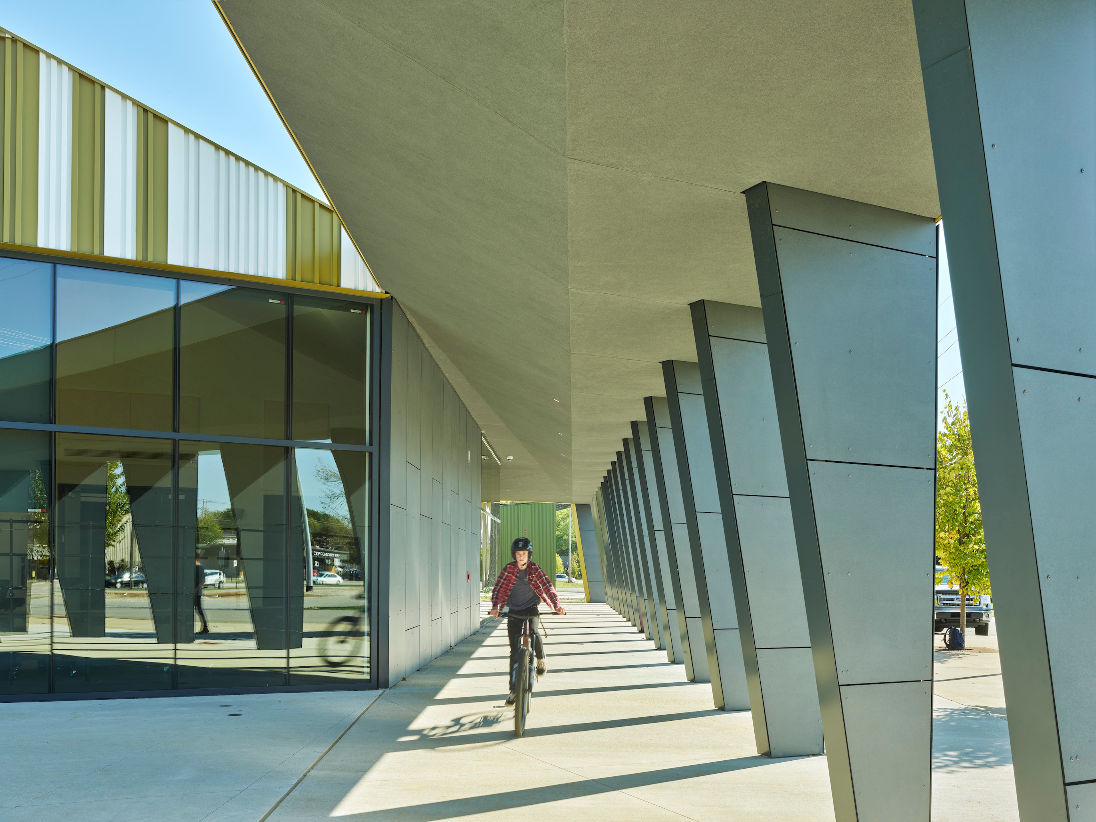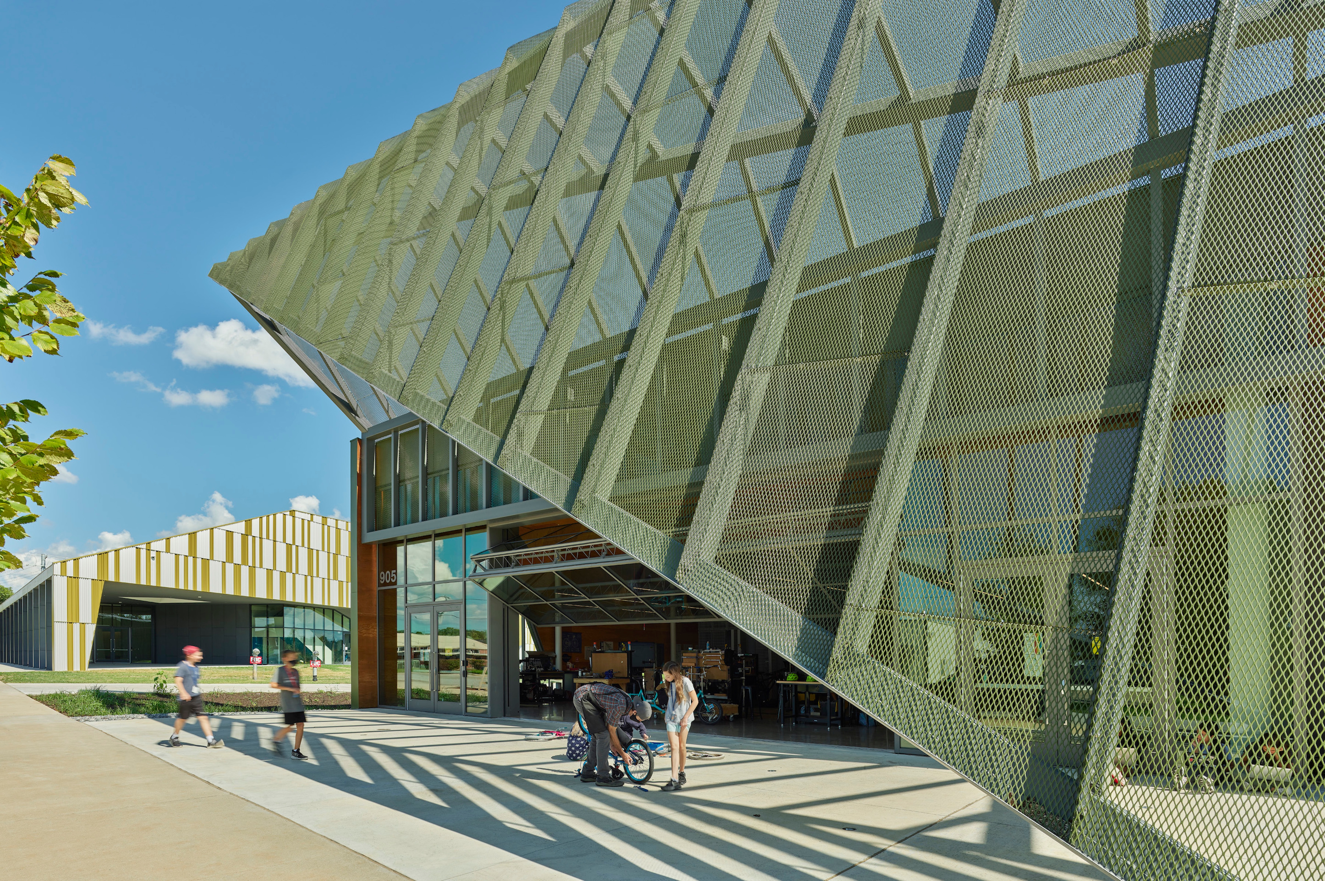 Wheels Science and Fabrication Building (August 2020). Home to the signature Wheels program, the Science and Fabrication Building creates a public presence for the school by linking the campus to Bentonville Square. Situated west of the 2 student commons and south of the Thaden Performance building, the building opens to the east to create a sense of entrance and arrival. A canopy along Main Street acts as a “billboard” for the campus and creates an outdoor workspace for the Wheels lab. Similar to the Arts and Administration Building, the Wheels building roof is a performative response as much as it is a figural expression.