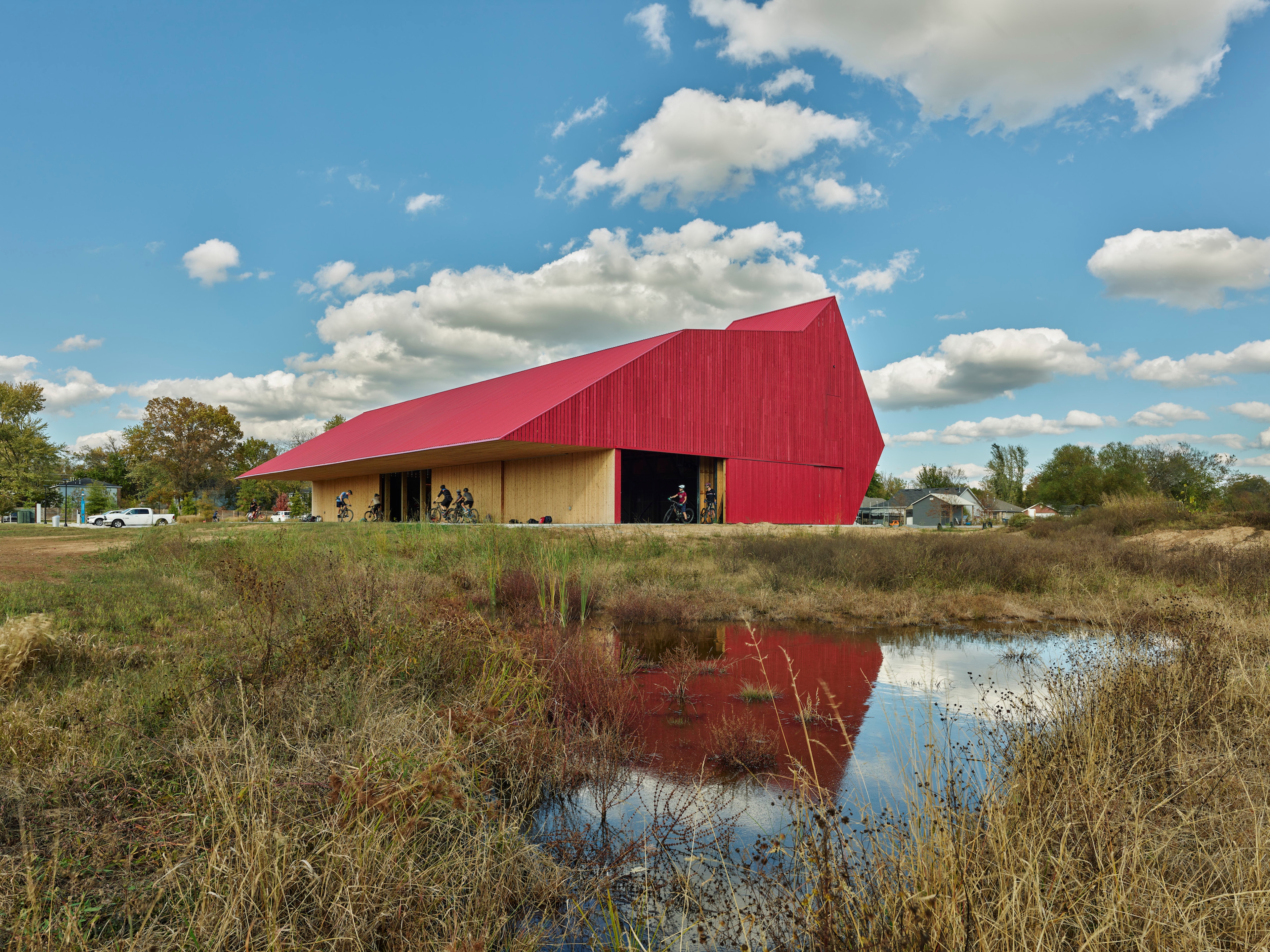 Bike Barn (May 2020). Sited on a berm on the eastern edge of the campus next to the soccer field, the cyclo-cross, and the pump track, the Bike Barn is integrated into a network of pedestrian pathways that connect Thaden School to a larger system of trails that extend throughout northwest Arkansas. By reconfiguring the profile of an Ozark gambrel barn to maximize the height below the trusses, a variety of sports can be accommodated, including volleyball, basketball, and cycling, while also providing bike storage and support facilities. A local manufacturer fabricated the trusses, which were developed collaboratively using local materials and expertise. The exterior walls are clad in locally sourced cypress and finished with a combination of red paint traditionally used on barns or a clear finish that protects the wood. On the west side, a deep porch faces the soccer field and provides shelter and shade for spectators. Except for storage and locker rooms, the entire space is naturally ventilated through a mix of open joints in the cypress board siding, vented skylights, and a series of roller doors that open to the surrounding landscape.