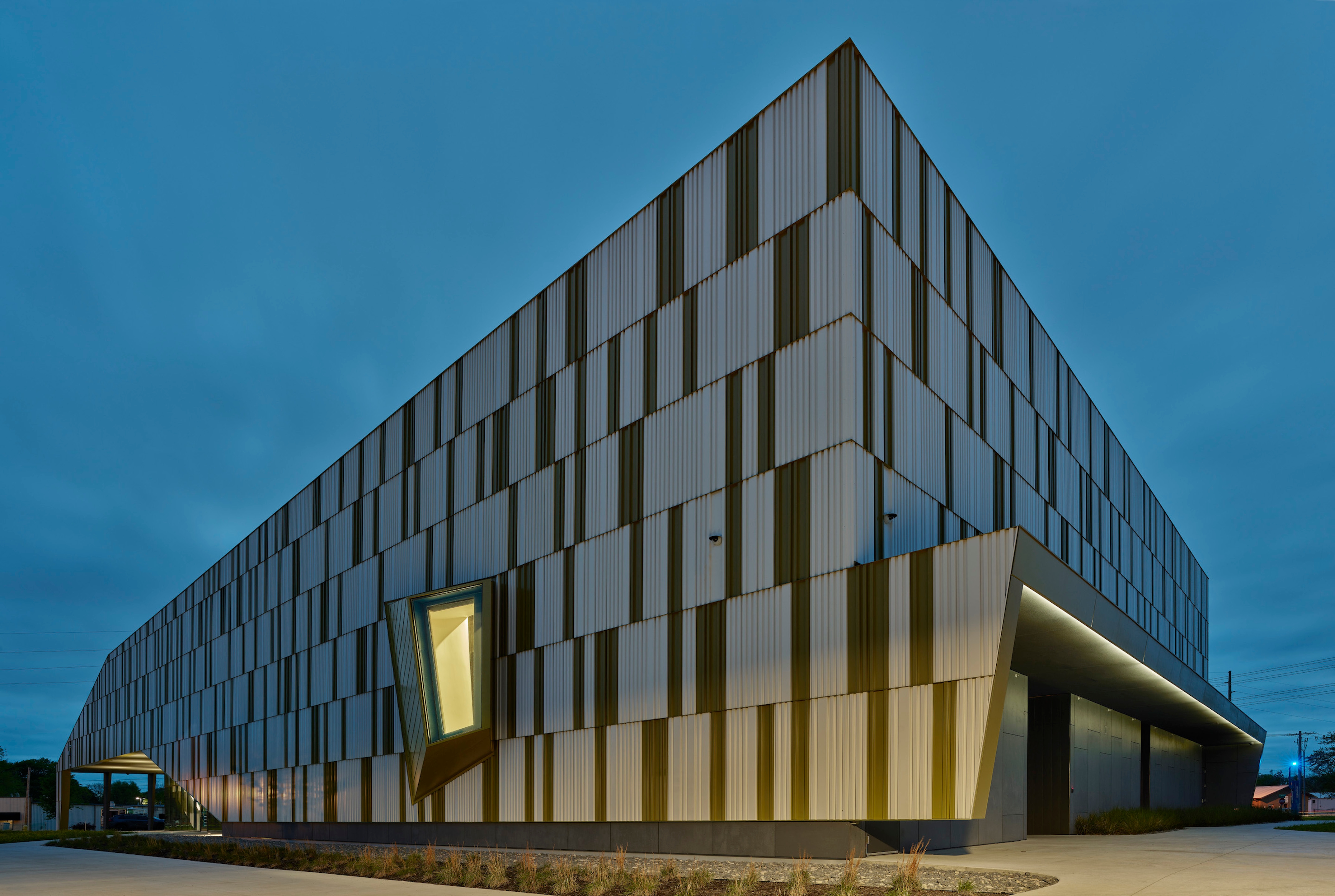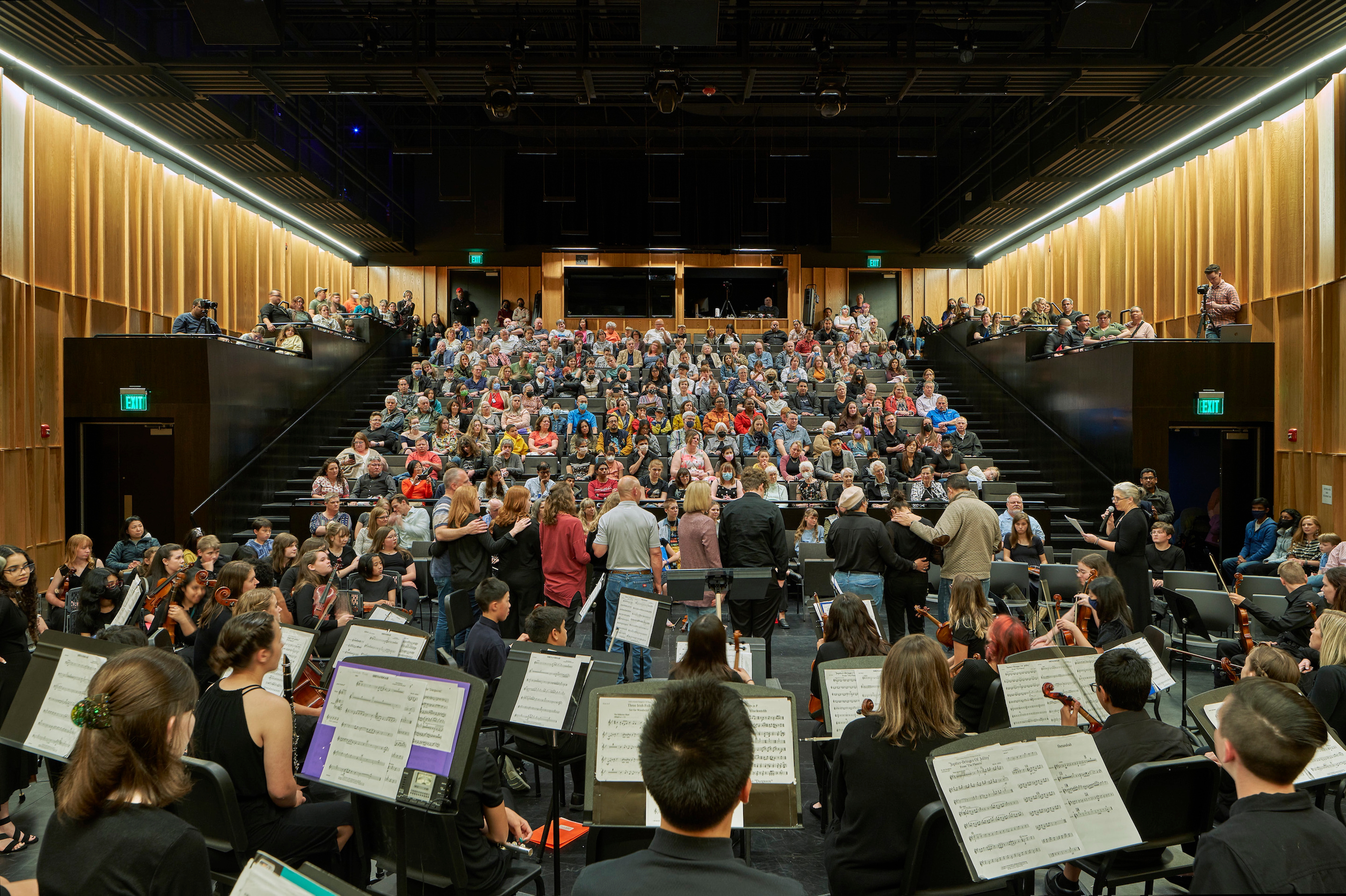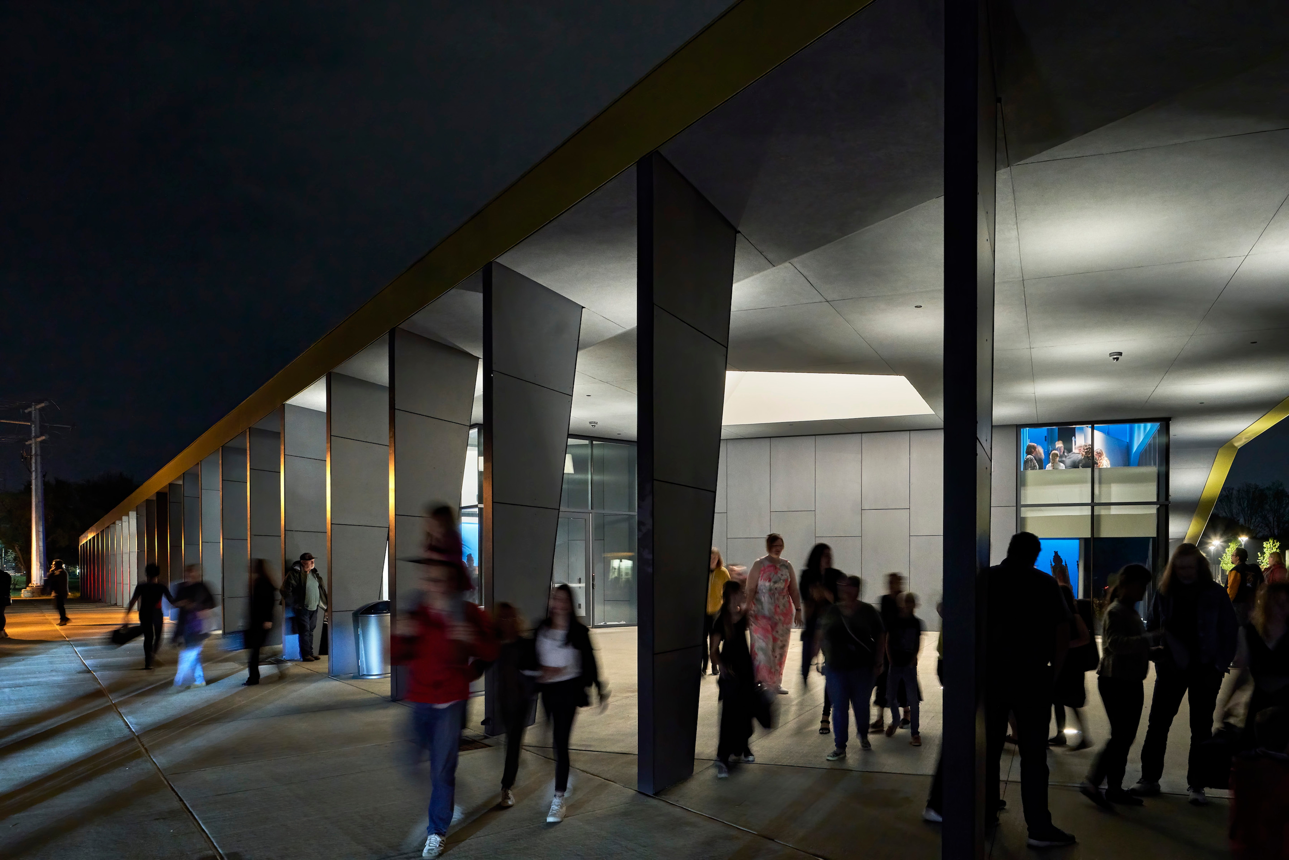 Performance (November 2021). As envisioned in the campus master plan, Performance is situated on the northwest corner of the main campus and, by virtue of its location, is highly visible to the public and serves as an inviting hub for community connection while maintaining campus security. The building supports a wide variety of educational programs in the performing arts, including music, drama, and film, all with ready access to a world-class performance venue. The versatile and efficient allocation of space advances the school’s mission and identity as a stage for improvisation, experimentation, and imagination. A generous loggia and expressive canopy create a strong and welcoming street edge. They extend well beyond the main body of the building and lead to a skylit entryway. Other than the glazing on each side revealed when the multicolored metal shell lifts, only one large window in the 3 performance halls punctuates the exterior shell. Looking out to the campus and the original Thaden House, this monumental window is even larger on the interior, which brings soft, indirect light into an otherwise sealed performance hall. With direct connections from the stage to the back of the house, the performance hall is a versatile and professional venue for creative performance.