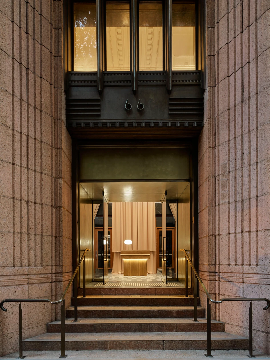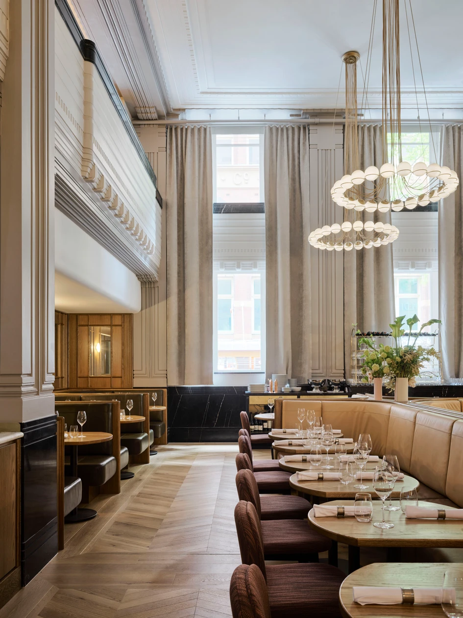 Entering via King Street, patrons are greeted with layers of velvet curtains with a dimly lit concierge – curating the arrival experience, whether being guided to the grand brasserie or the bar a vin. The grand double height volume of the brasserie is tied together by a sculpted joinery stair heroing local craftsmanship. The bold central banquette in Tibero stone occupies the ground floor and gazes toward the open kitchen to take in the theatrics of the dining experience.